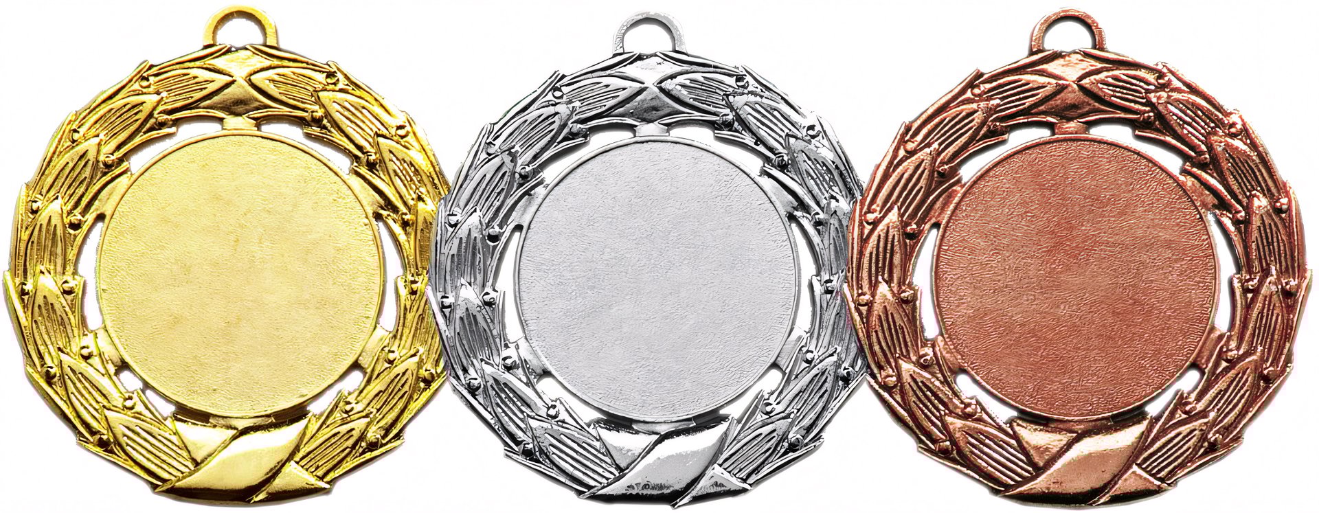 3er-Medaillenserie in Gold, Silber, Bronze mit einem Durchmesser von 8.5 cm. Emblem in 50 mm Durchmesser wählbar aus über 300 Designs oder einem eigenen Emblem. ist universell für jede Zielgruppe/Sportart einsetzbar.