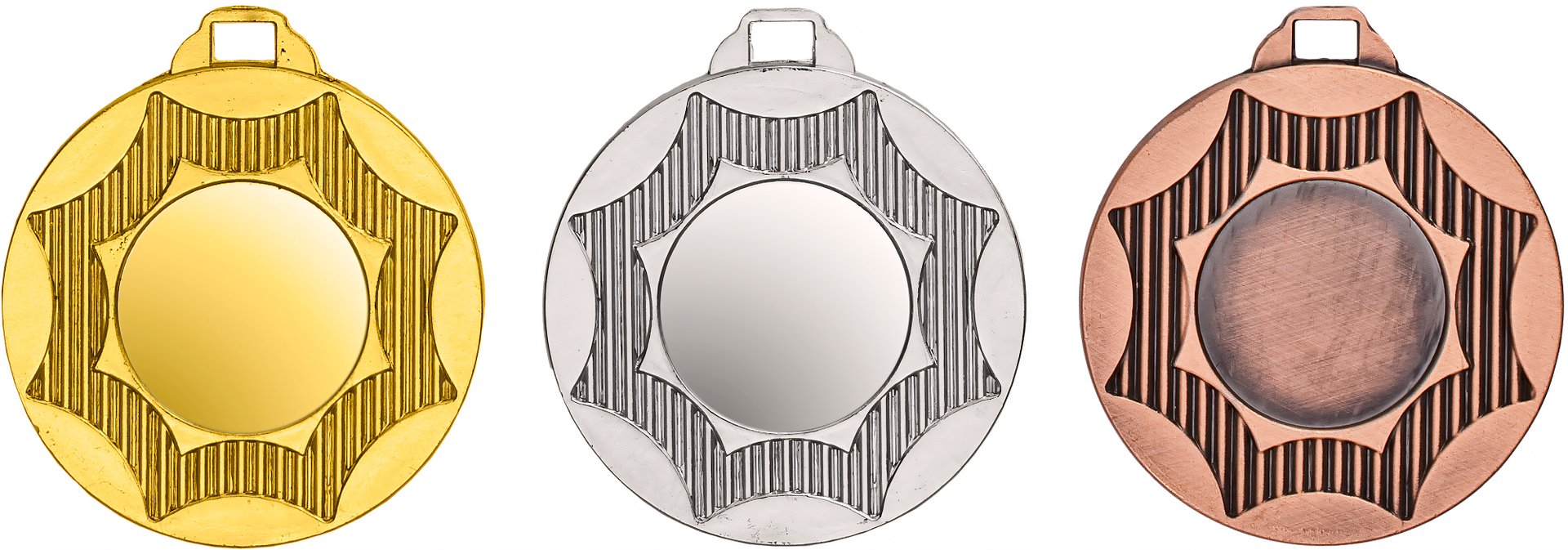 3er-Medaillenserie in Gold, Silber, Bronze mit einem Durchmesser von 5 cm. Emblem in 25 mm Durchmesser wählbar aus über 300 Designs oder einem eigenen Emblem. ist universell für jede Zielgruppe/Sportart einsetzbar.