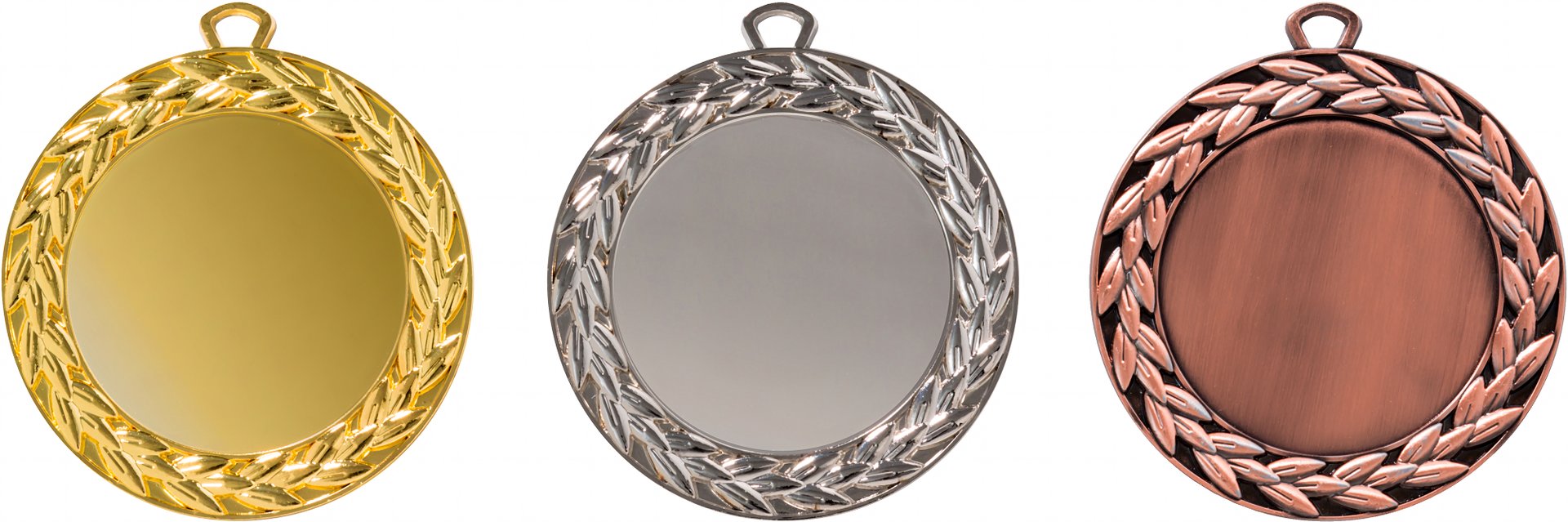 3er-Medaillenserie in Gold, Silber, Bronze mit einem Durchmesser von 7 cm. Emblem in 50 mm Durchmesser wählbar aus über 300 Designs oder einem eigenen Emblem. ist universell für jede Zielgruppe/Sportart einsetzbar.