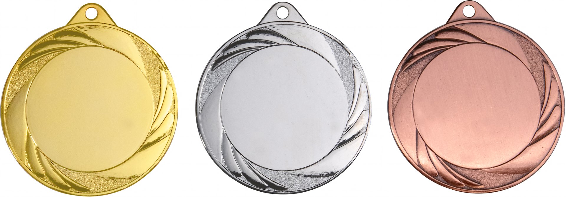 3er-Medaillenserie in Gold, Silber, Bronze mit einem Durchmesser von 7 cm. Emblem in 50 mm Durchmesser wählbar aus über 300 Designs oder einem eigenen Emblem. ist universell für jede Zielgruppe/Sportart einsetzbar.