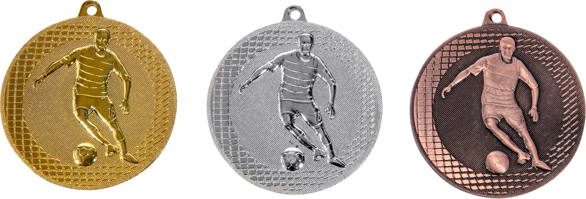 3er-Medaillenserie in Gold, Silber, Bronze mit einem Durchmesser von 5 cm. ist speziell für folgende Zielgruppe/Sportart: Fußball.