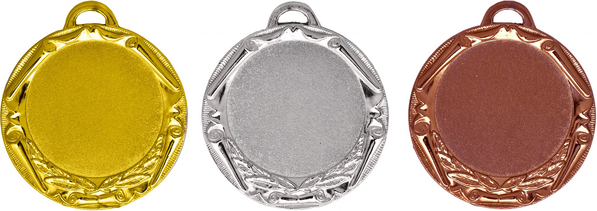 3er-Medaillenserie in Gold, Silber, Bronze mit einem Durchmesser von 7 cm. Emblem in 50 mm Durchmesser wählbar aus über 300 Designs oder einem eigenen Emblem.  ist universell für jede Zielgruppe/Sportart einsetzbar.