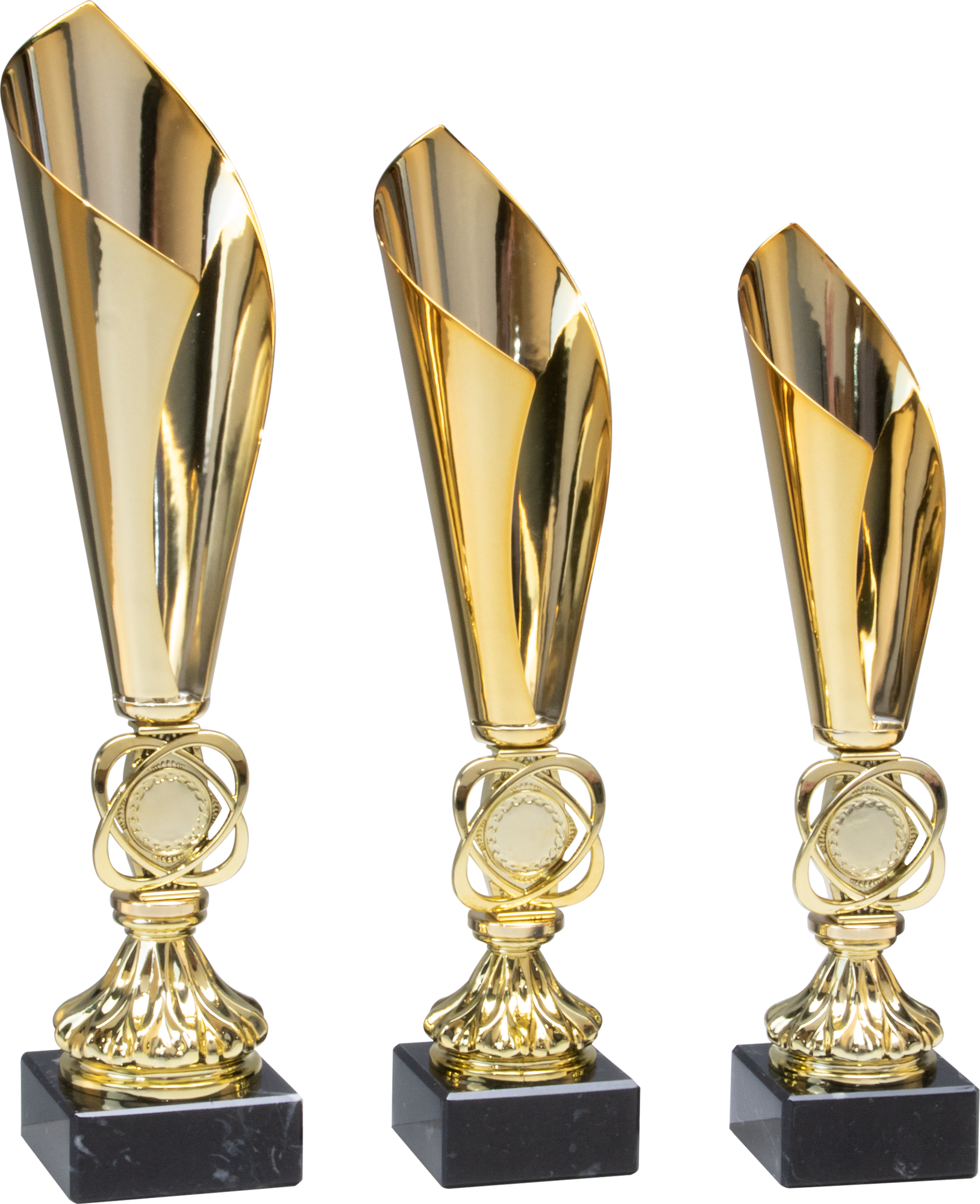 Pokal in Gold von 29,5 cm – 36,5 cm Höhe in Premium Qualität. Individuelle Sockelbeschriftung auf Gravurplatte. Emblem in 25 mm Durchmesser wählbar aus über 300 Designs oder einem eigenen Emblem. Dieser Pokal ist universell für jede Zielgruppe/Sportart einsetzbar. Als 3er-Serie erhältlich.