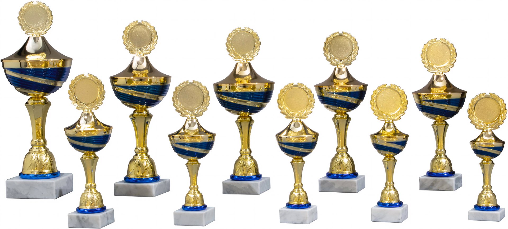 Pokal in Gold, Blau von 26,7 cm – 45 cm Höhe in Standard Qualität. Individuelle Sockelbeschriftung auf Gravurplatte. Emblem in 50 mm Durchmesser wählbar aus über 300 Designs oder einem eigenen Emblem. Dieser Pokal ist universell für jede Zielgruppe/Sportart einsetzbar. Als 10er-Serie erhältlich.
