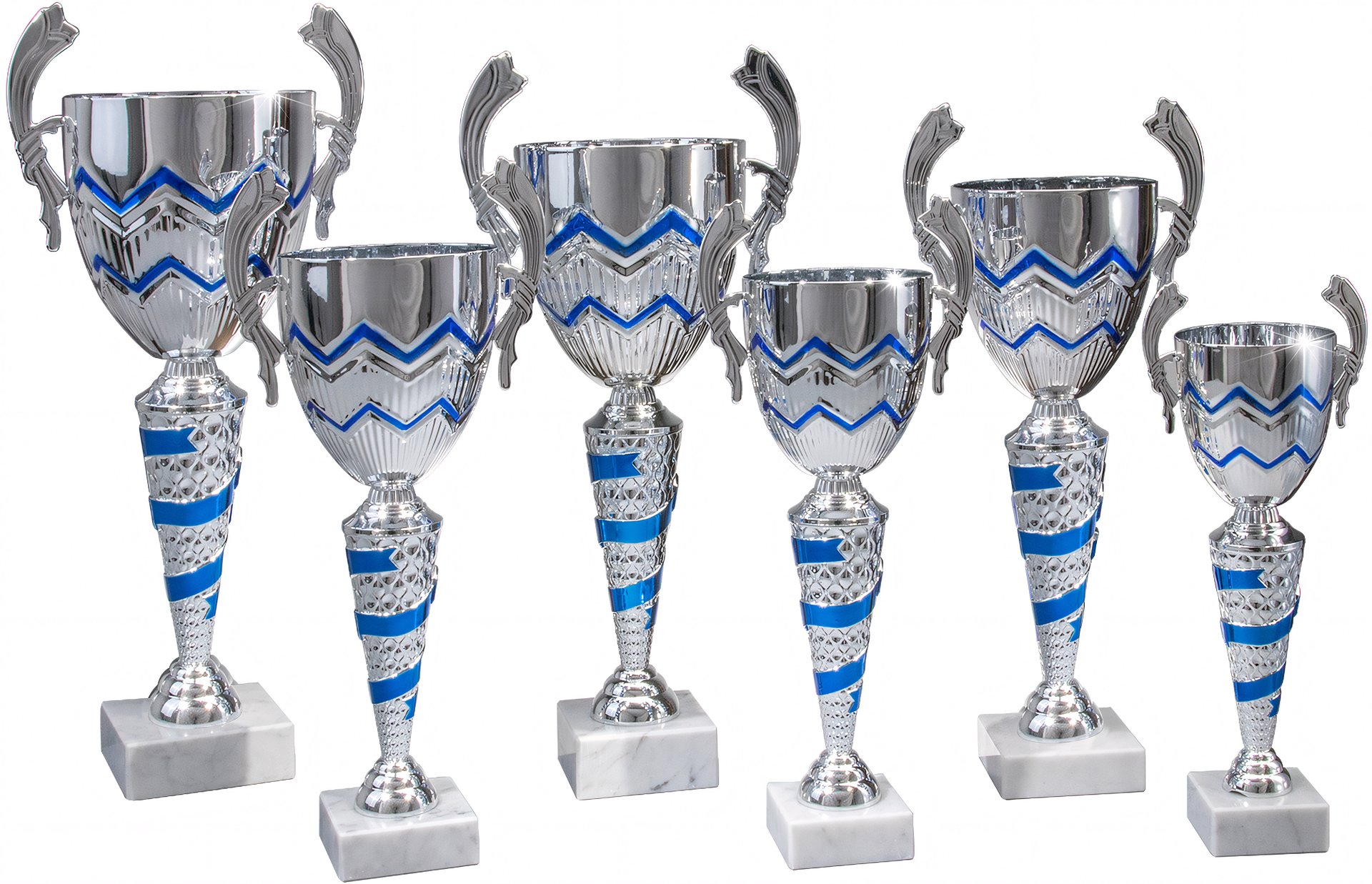 Pokal in Silber, Blau von 35 cm – 54,3 cm Höhe in Premium Qualität. Individuelle Sockelbeschriftung auf Gravurplatte. Dieser Pokal ist universell für jede Zielgruppe/Sportart einsetzbar. Als 6er-Serie erhältlich.