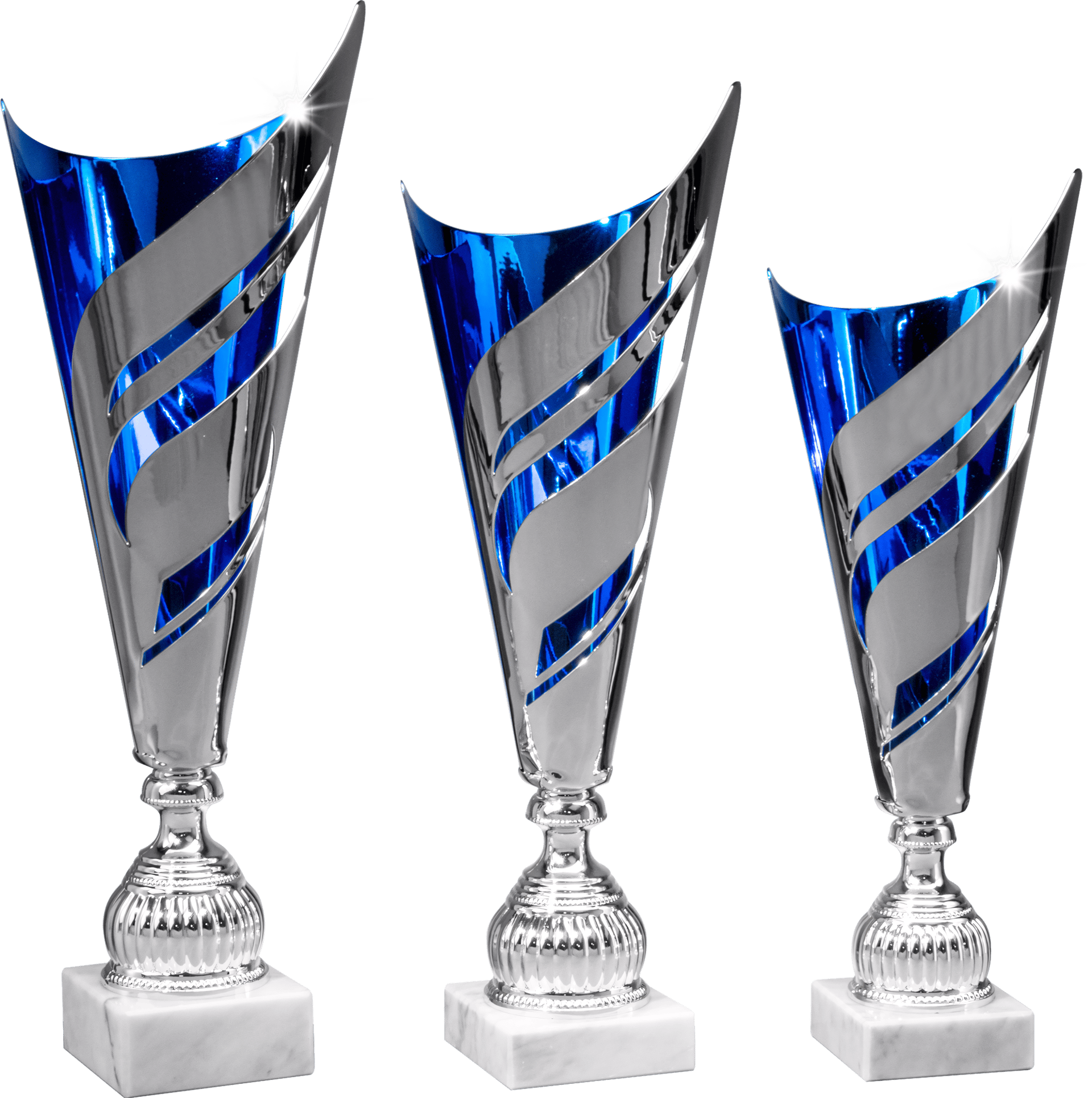 Pokal in Silber, Blau von 44,5 cm – 52,5 cm Höhe in Deluxe Qualität. Individuelle Sockelbeschriftung auf Gravurplatte. Dieser Pokal ist universell für jede Zielgruppe/Sportart einsetzbar. Als 3er-Serie erhältlich.