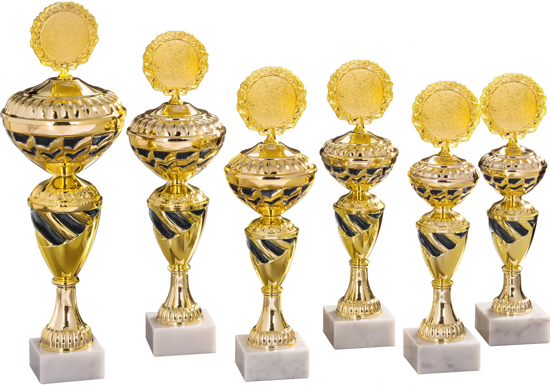 Pokal in Gold, Schwarz von 28 cm – 37,4 cm Höhe in Standard Qualität. Individuelle Sockelbeschriftung auf Gravurplatte. Emblem in 50 mm Durchmesser wählbar aus über 300 Designs oder einem eigenen Emblem. Dieser Pokal ist universell für jede Zielgruppe/Sportart einsetzbar. Als 6er-Serie erhältlich.