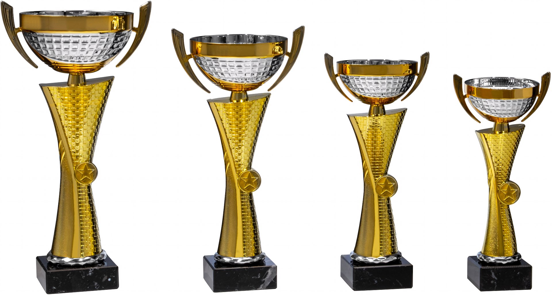 Pokal in Gold, Silber von 26 cm – 35,5 cm Höhe in Standard Qualität. Individuelle Sockelbeschriftung auf Gravurplatte. Emblem in 25 mm Durchmesser wählbar aus über 300 Designs oder einem eigenen Emblem. Dieser Pokal ist universell für jede Zielgruppe/Sportart einsetzbar. Als 4er-Serie erhältlich.