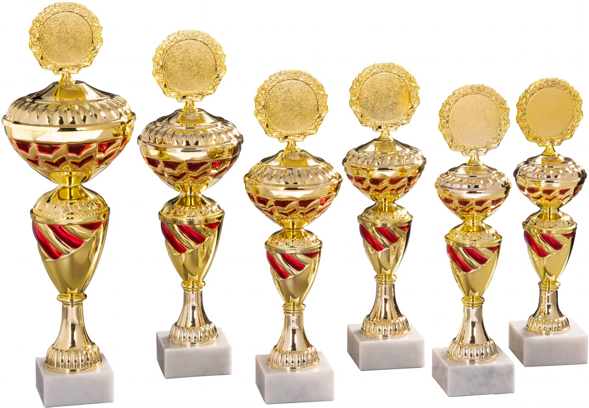 Pokal in Gold, Rot von 28 cm – 37,4 cm Höhe in Standard Qualität. Individuelle Sockelbeschriftung auf Gravurplatte. Emblem in 50 mm Durchmesser wählbar aus über 300 Designs oder einem eigenen Emblem. Dieser Pokal ist universell für jede Zielgruppe/Sportart einsetzbar. Als 6er-Serie erhältlich.