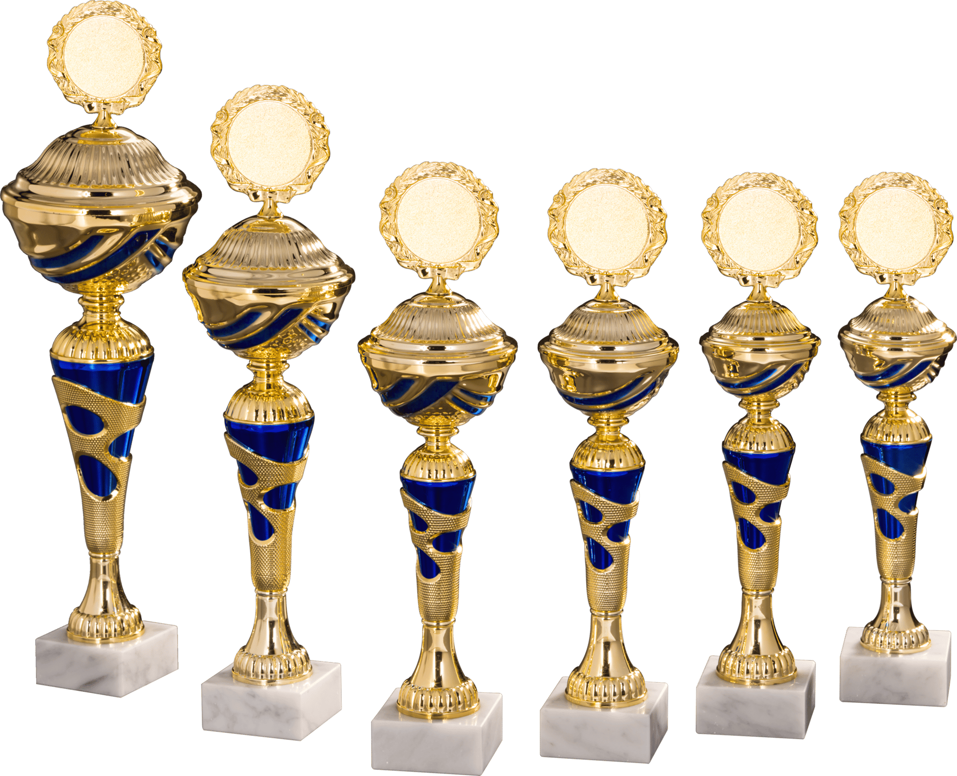 Pokal in Gold, Blau von 32,5 cm – 42,9 cm Höhe in Standard Qualität. Individuelle Sockelbeschriftung auf Gravurplatte. Emblem in 50 mm Durchmesser wählbar aus über 300 Designs oder einem eigenen Emblem. Dieser Pokal ist universell für jede Zielgruppe/Sportart einsetzbar. Als 6er-Serie erhältlich.