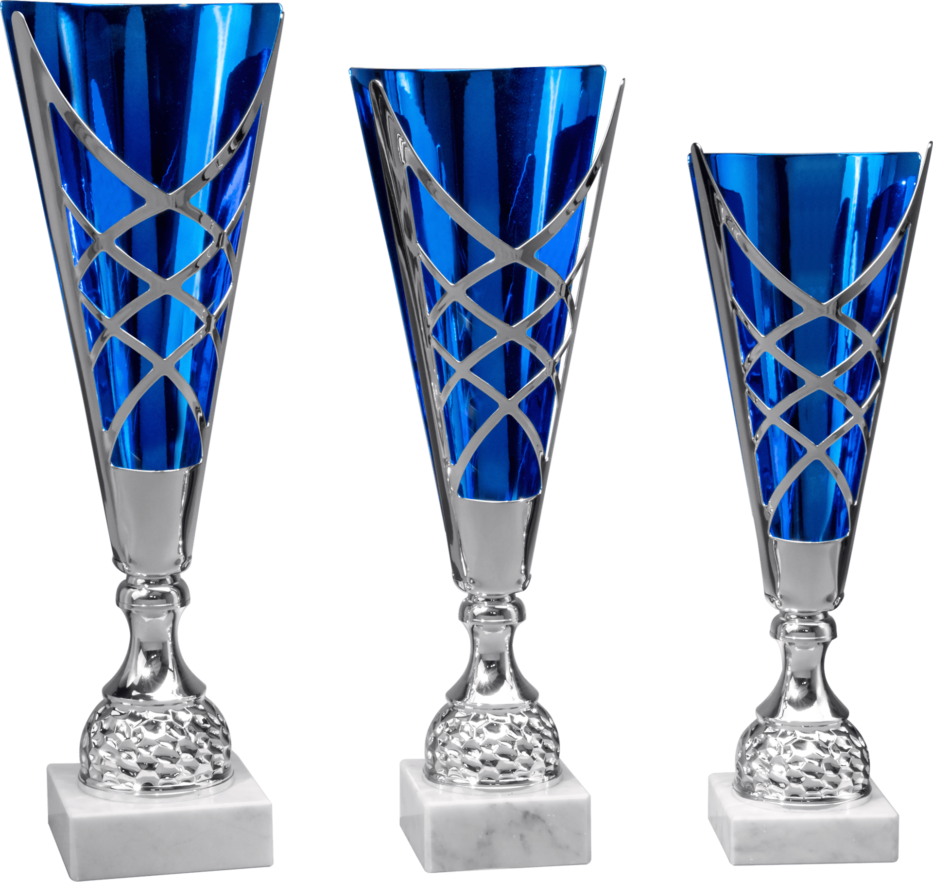 Pokal in Silber, Blau von 42 cm – 50,5 cm Höhe in Deluxe Qualität. Individuelle Sockelbeschriftung auf Gravurplatte. Dieser Pokal ist universell für jede Zielgruppe/Sportart einsetzbar. Als 3er-Serie erhältlich.
