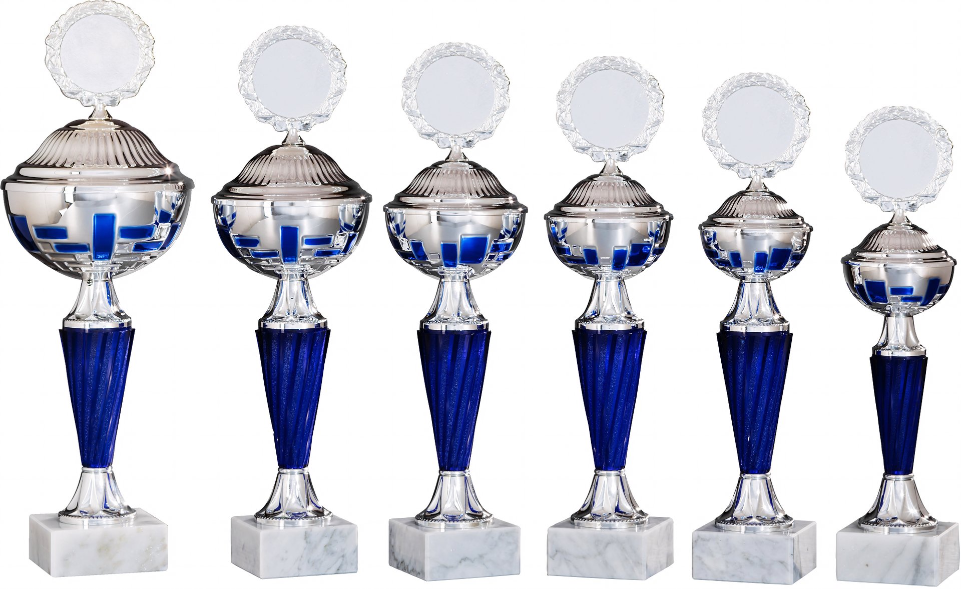 Pokal in Silber, Blau von 29,5 cm – 36 cm Höhe in Standard Qualität. Individuelle Sockelbeschriftung auf Gravurplatte. Emblem in 50 mm Durchmesser wählbar aus über 300 Designs oder einem eigenen Emblem. Dieser Pokal ist universell für jede Zielgruppe/Sportart einsetzbar. Als 6er-Serie erhältlich.