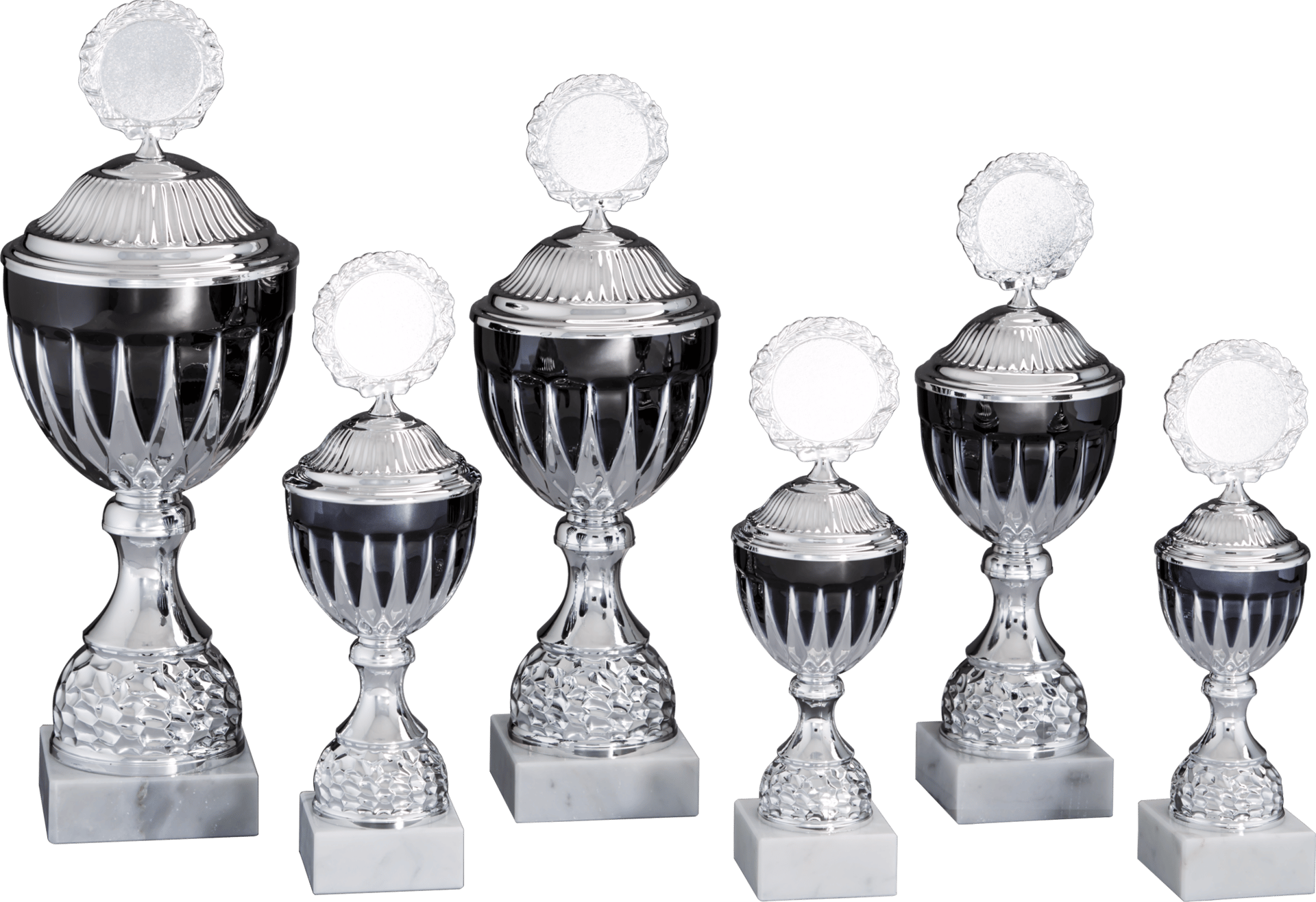 Pokal in Silber, Schwarz von 24,7 cm – 38,9 cm Höhe in Standard Qualität. Individuelle Sockelbeschriftung auf Gravurplatte. Emblem in 50 mm Durchmesser wählbar aus über 300 Designs oder einem eigenen Emblem. Dieser Pokal ist universell für jede Zielgruppe/Sportart einsetzbar. Als 6er-Serie erhältlich.