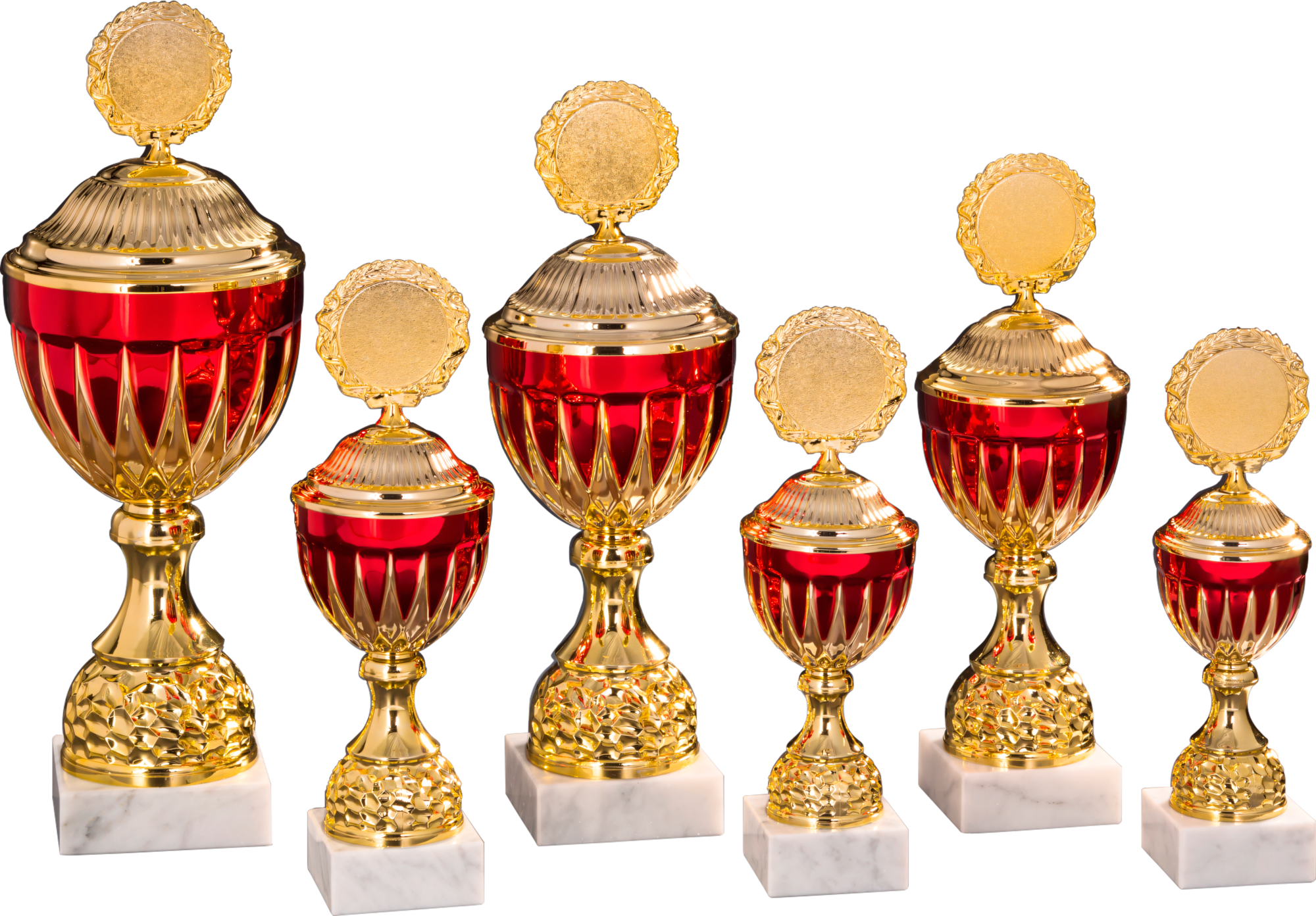 Pokal in Gold, Rot von 24,7 cm – 38,9 cm Höhe in Standard Qualität. Individuelle Sockelbeschriftung auf Gravurplatte. Emblem in 50 mm Durchmesser wählbar aus über 300 Designs oder einem eigenen Emblem. Dieser Pokal ist universell für jede Zielgruppe/Sportart einsetzbar. Als 6er-Serie erhältlich.