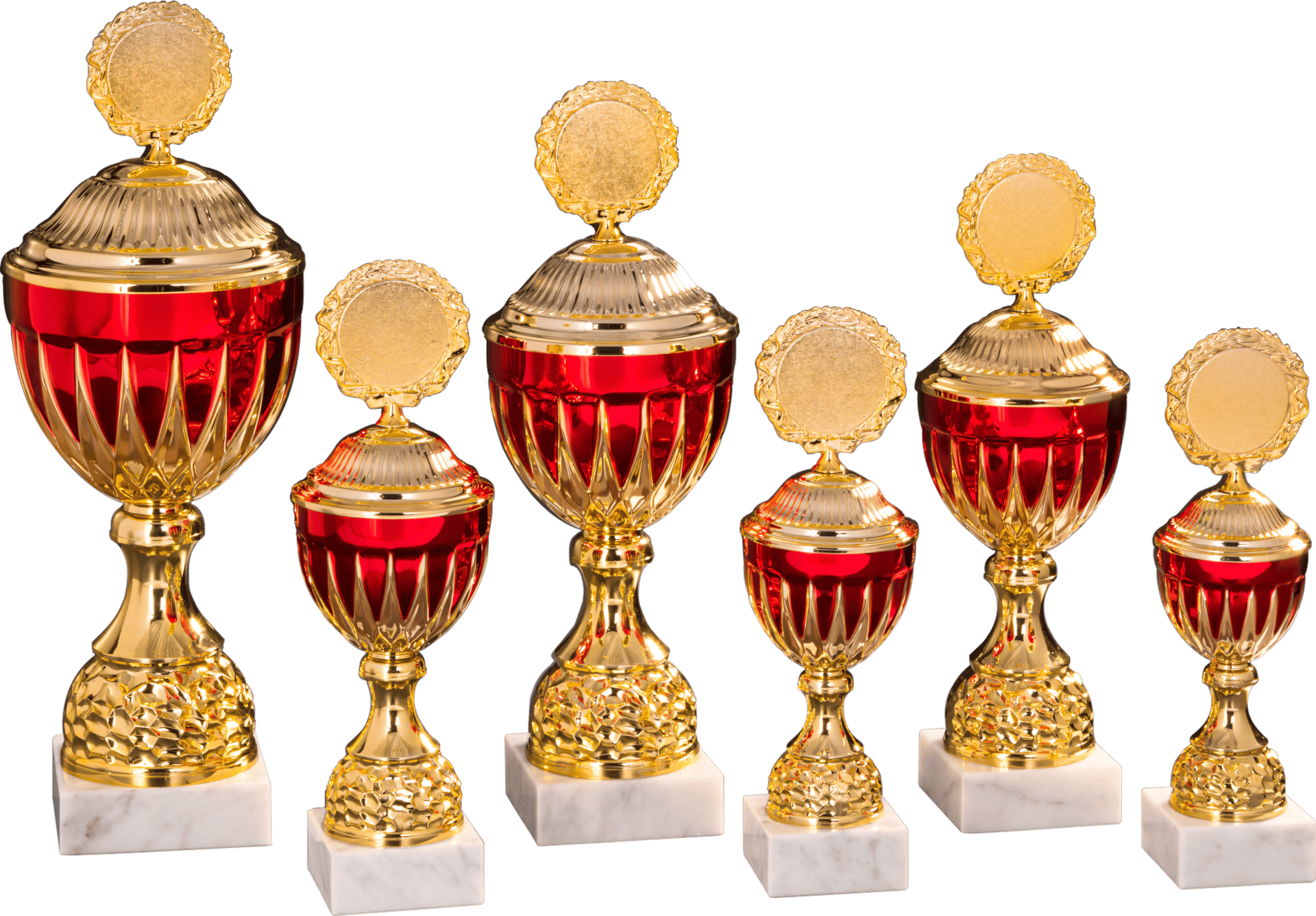 Pokal in Gold, Rot von 24,7 cm – 38,9 cm Höhe in Standard Qualität. Individuelle Sockelbeschriftung auf Gravurplatte. Emblem in 50 mm Durchmesser wählbar aus über 300 Designs oder einem eigenen Emblem. Dieser Pokal ist universell für jede Zielgruppe/Sportart einsetzbar. Als 6er-Serie erhältlich.