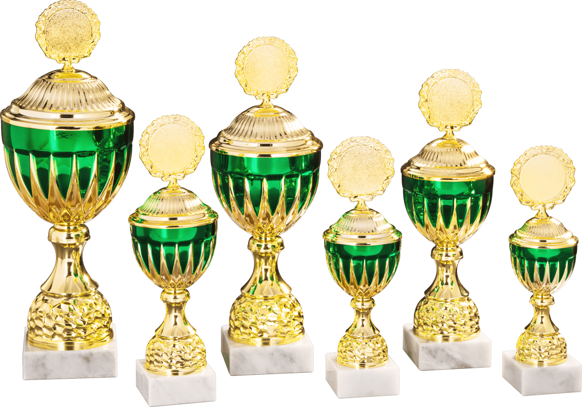 Pokal in Gold, Grün von 24,7 cm – 38,9 cm Höhe in Standard Qualität. Individuelle Sockelbeschriftung auf Gravurplatte. Emblem in 50 mm Durchmesser wählbar aus über 300 Designs oder einem eigenen Emblem. Dieser Pokal ist universell für jede Zielgruppe/Sportart einsetzbar. Als 6er-Serie erhältlich.