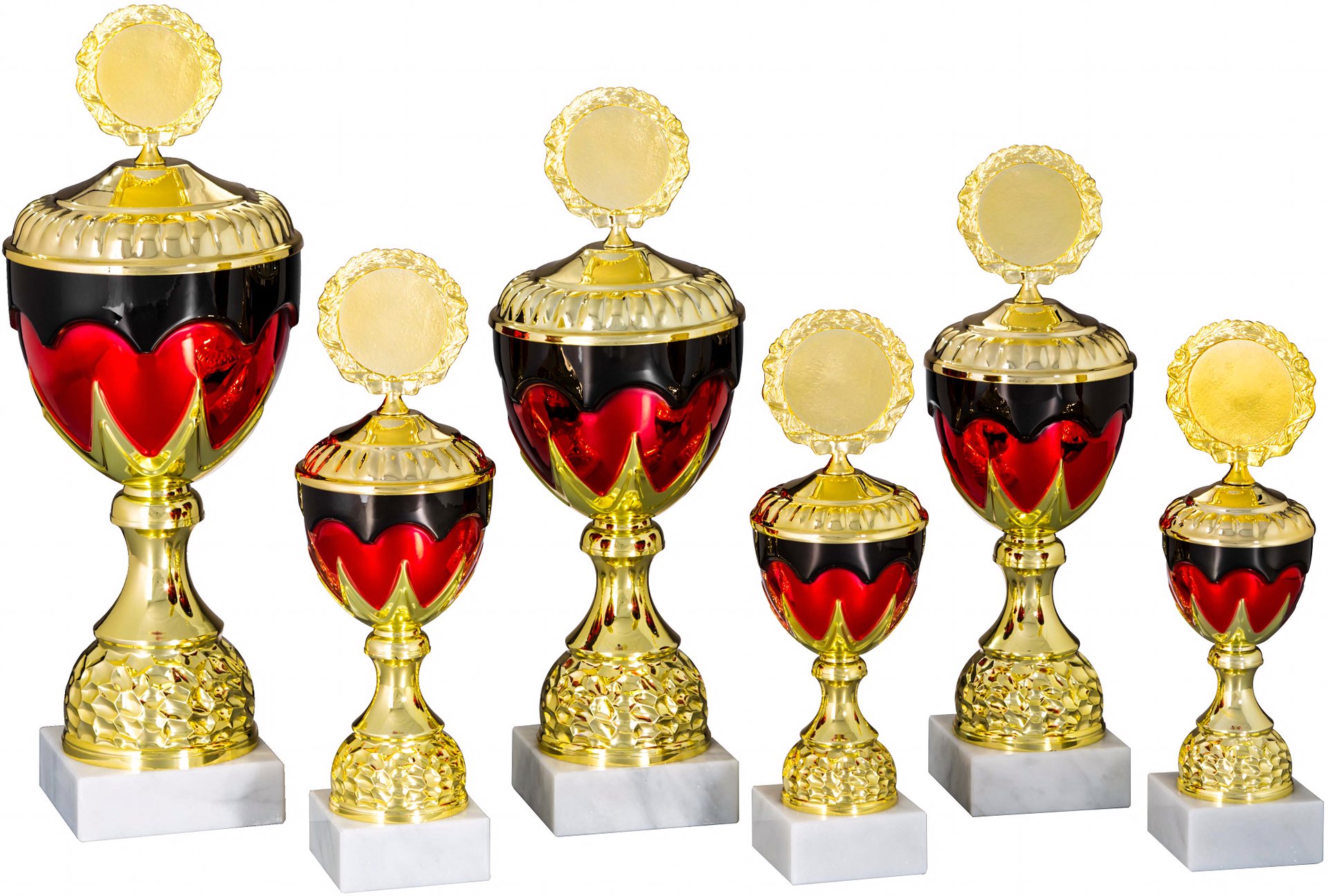 Pokal in Schwarz, Rot, Gold von 24 cm – 38 cm Höhe in Standard Qualität. Individuelle Sockelbeschriftung auf Gravurplatte. Emblem in 50 mm Durchmesser wählbar aus über 300 Designs oder einem eigenen Emblem. Dieser Pokal ist universell für jede Zielgruppe/Sportart einsetzbar. Als 6er-Serie erhältlich.