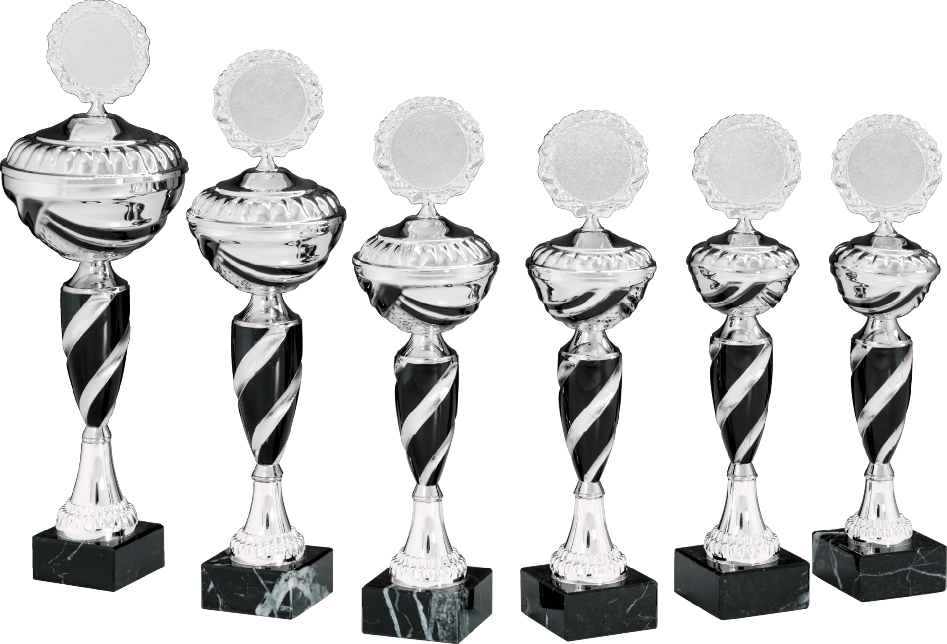 Pokal in Silber, Schwarz von 30 cm – 37,5 cm Höhe in Standard Qualität. Individuelle Sockelbeschriftung auf Gravurplatte. Emblem in 50 mm Durchmesser wählbar aus über 300 Designs oder einem eigenen Emblem. Dieser Pokal ist universell für jede Zielgruppe/Sportart einsetzbar. Als 6er-Serie erhältlich.