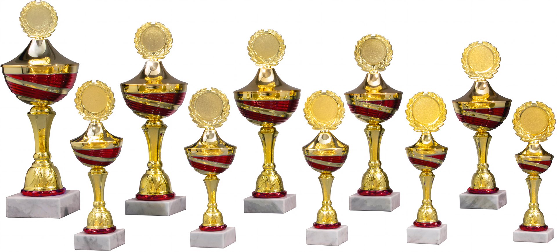 Pokal in Gold, Rot von 26,7 cm – 45 cm Höhe in Standard Qualität. Individuelle Sockelbeschriftung auf Gravurplatte. Emblem in 50 mm Durchmesser wählbar aus über 300 Designs oder einem eigenen Emblem. Dieser Pokal ist universell für jede Zielgruppe/Sportart einsetzbar. Als 10er-Serie erhältlich.