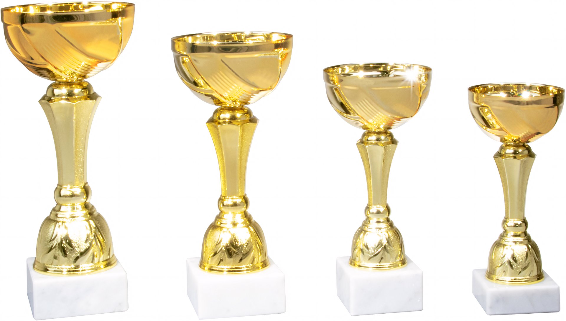 Pokal in Gold von 15,7 cm – 22 cm Höhe in Standard Qualität. Individuelle Sockelbeschriftung auf Gravurplatte. Dieser Pokal ist universell für jede Zielgruppe/Sportart einsetzbar. Als 4er-Serie erhältlich.