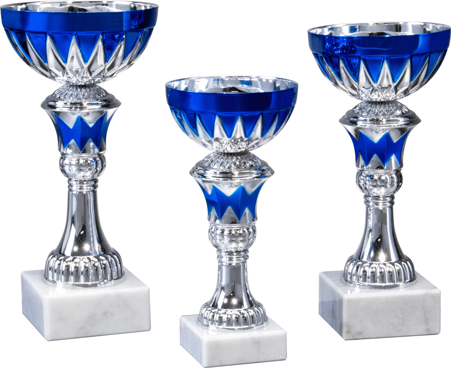 Pokal in Silber, Blau von 18 cm – 21 cm Höhe in Standard Qualität. Individuelle Sockelbeschriftung auf Gravurplatte. Dieser Pokal ist universell für jede Zielgruppe/Sportart einsetzbar. Als 3er-Serie erhältlich.