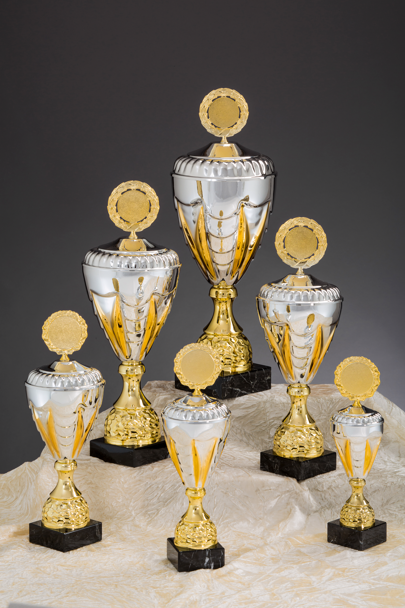 Pokal in Gold, Silber von 27,5 cm – 50,8 cm Höhe in Standard Qualität. Individuelle Sockelbeschriftung auf Gravurplatte. Emblem in 50 mm Durchmesser wählbar aus über 300 Designs oder einem eigenen Emblem. Dieser Pokal ist universell für jede Zielgruppe/Sportart einsetzbar. Als 6er-Serie erhältlich.