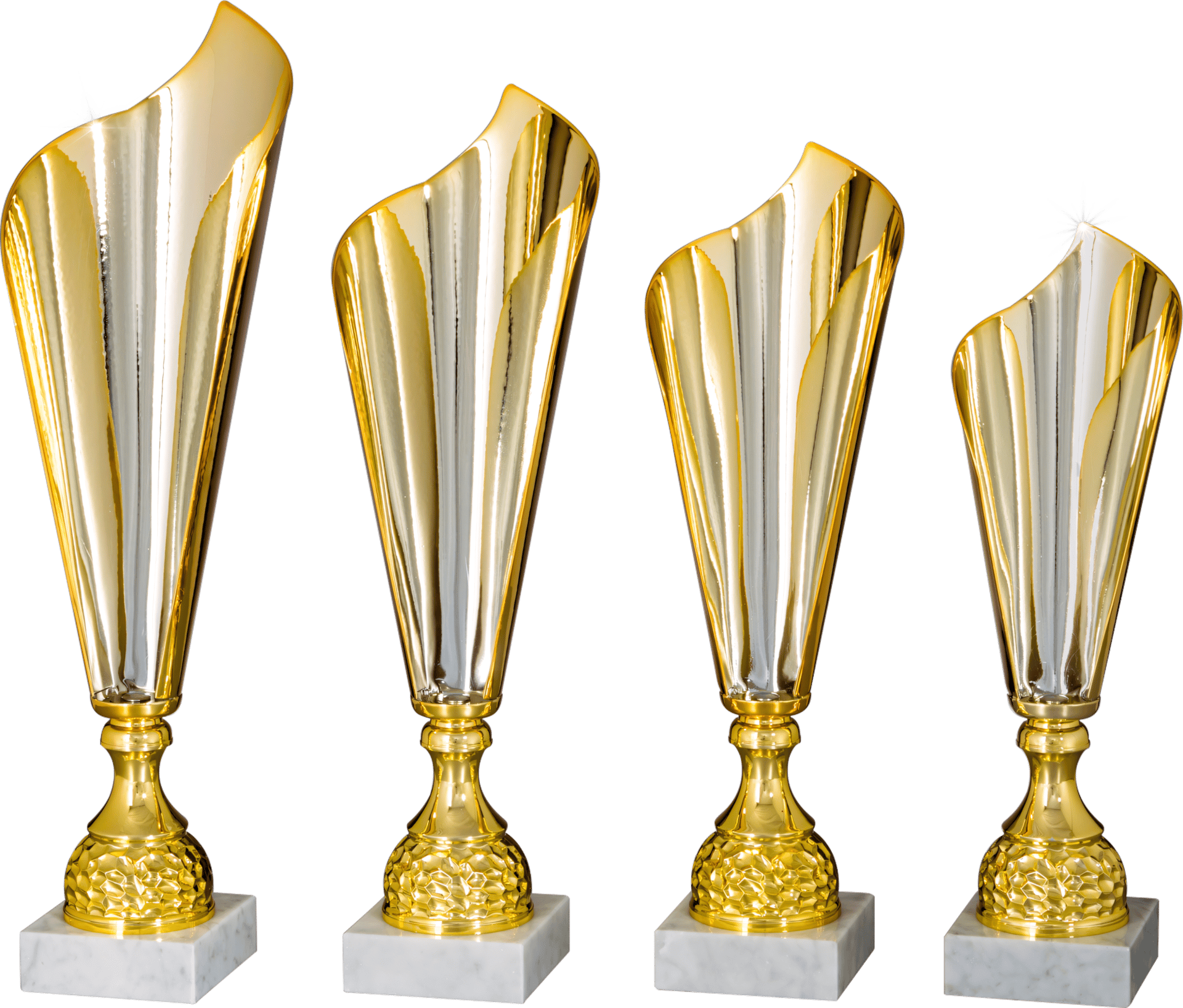 Pokal in Gold von 36 cm – 46,9 cm Höhe in Premium Qualität. Individuelle Sockelbeschriftung auf Gravurplatte. Dieser Pokal ist universell für jede Zielgruppe/Sportart einsetzbar. Als 4er-Serie erhältlich.