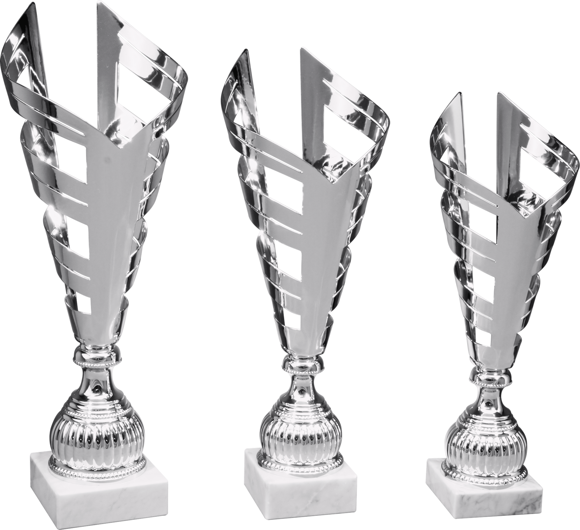 Pokal in Silber von 43 cm – 51,7 cm Höhe in Deluxe Qualität. Individuelle Sockelbeschriftung auf Gravurplatte. Dieser Pokal ist universell für jede Zielgruppe/Sportart einsetzbar. Als 3er-Serie erhältlich.