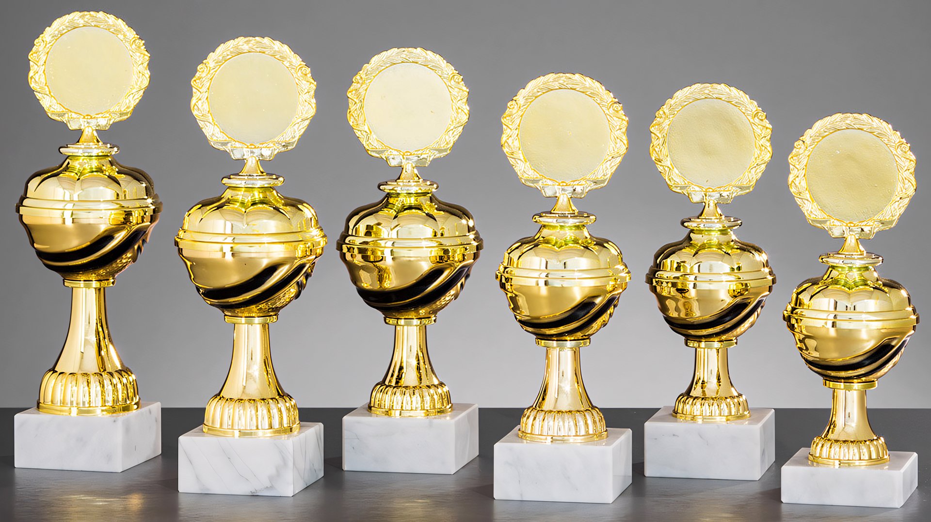 Pokal in Gold, Schwarz von 20,8 cm – 25,5 cm Höhe in Standard Qualität. Individuelle Sockelbeschriftung auf Gravurplatte. Emblem in 50 mm Durchmesser wählbar aus über 300 Designs oder einem eigenen Emblem. Dieser Pokal ist universell für jede Zielgruppe/Sportart einsetzbar. Als 6er-Serie erhältlich.
