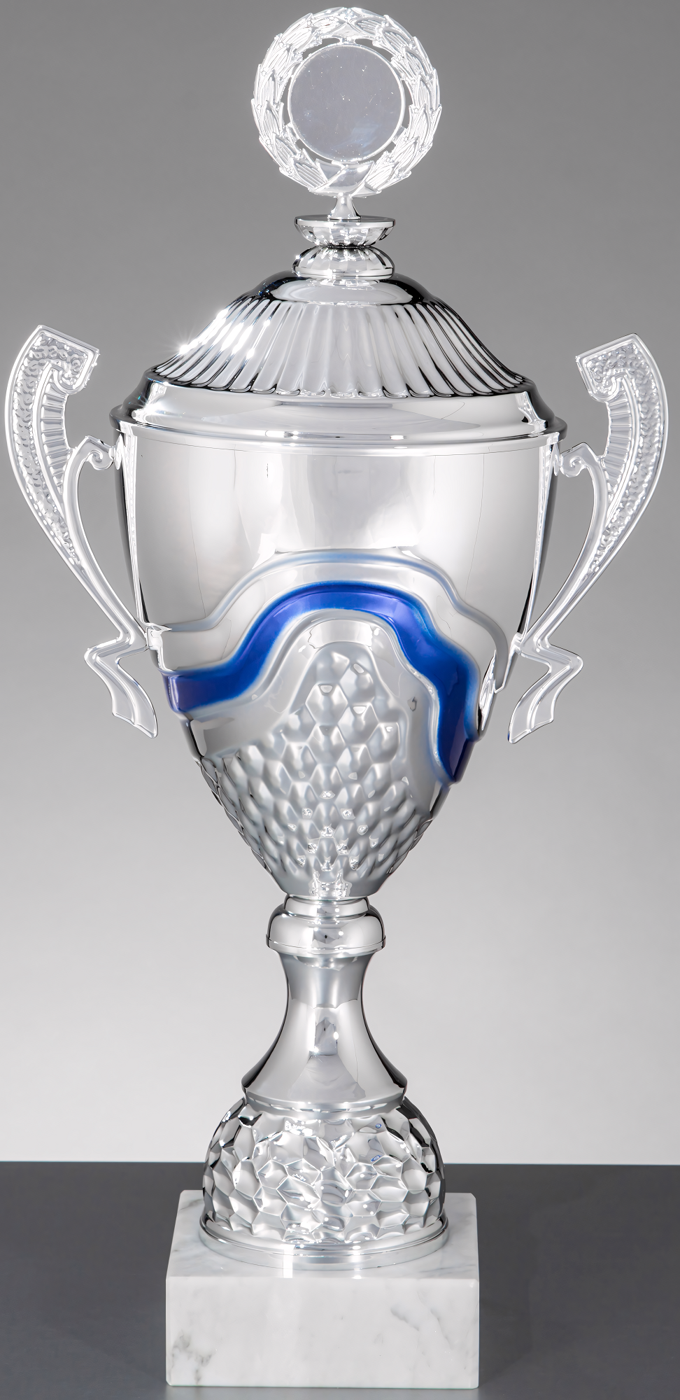 Pokal in Silber, Blau von 41,2 cm – 68 cm Höhe in Premium Qualität. Individuelle Sockelbeschriftung auf Gravurplatte. Emblem in 50 mm Durchmesser wählbar aus über 300 Designs oder einem eigenen Emblem. Dieser Pokal ist universell für jede Zielgruppe/Sportart einsetzbar. Als 8er-Serie erhältlich.