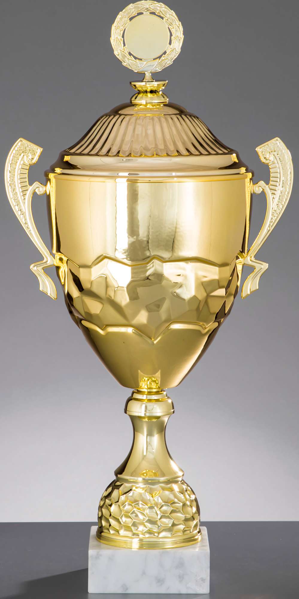 Pokal in Gold von 41,3 cm – 68 cm Höhe in Premium Qualität. Individuelle Sockelbeschriftung auf Gravurplatte. Emblem in 50 mm Durchmesser wählbar aus über 300 Designs oder einem eigenen Emblem. Dieser Pokal ist universell für jede Zielgruppe/Sportart einsetzbar. Als 8er-Serie erhältlich.