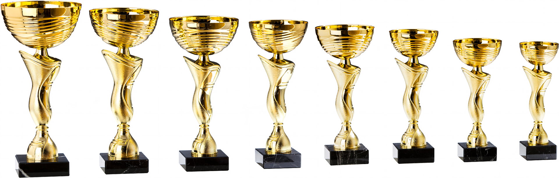 Pokal in Gold von 24 cm – 34,2 cm Höhe in Standard Qualität. Individuelle Sockelbeschriftung auf Gravurplatte. Dieser Pokal ist universell für jede Zielgruppe/Sportart einsetzbar. Als 8er-Serie erhältlich.