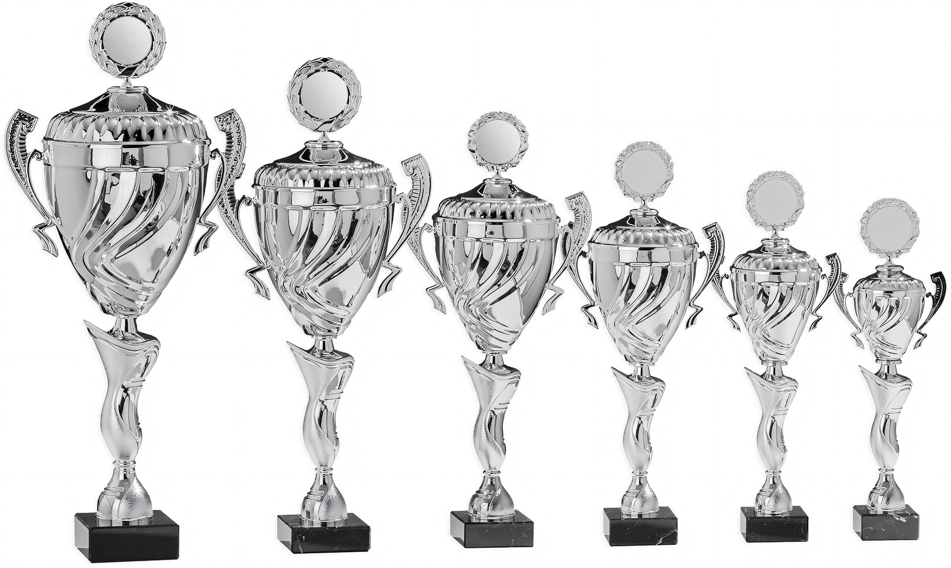 Pokal in Silber von 38 cm – 60,7 cm Höhe in Premium Qualität. Individuelle Sockelbeschriftung auf Gravurplatte. Emblem in 50 mm Durchmesser wählbar aus über 300 Designs oder einem eigenen Emblem. Dieser Pokal ist universell für jede Zielgruppe/Sportart einsetzbar. Als 6er-Serie erhältlich.