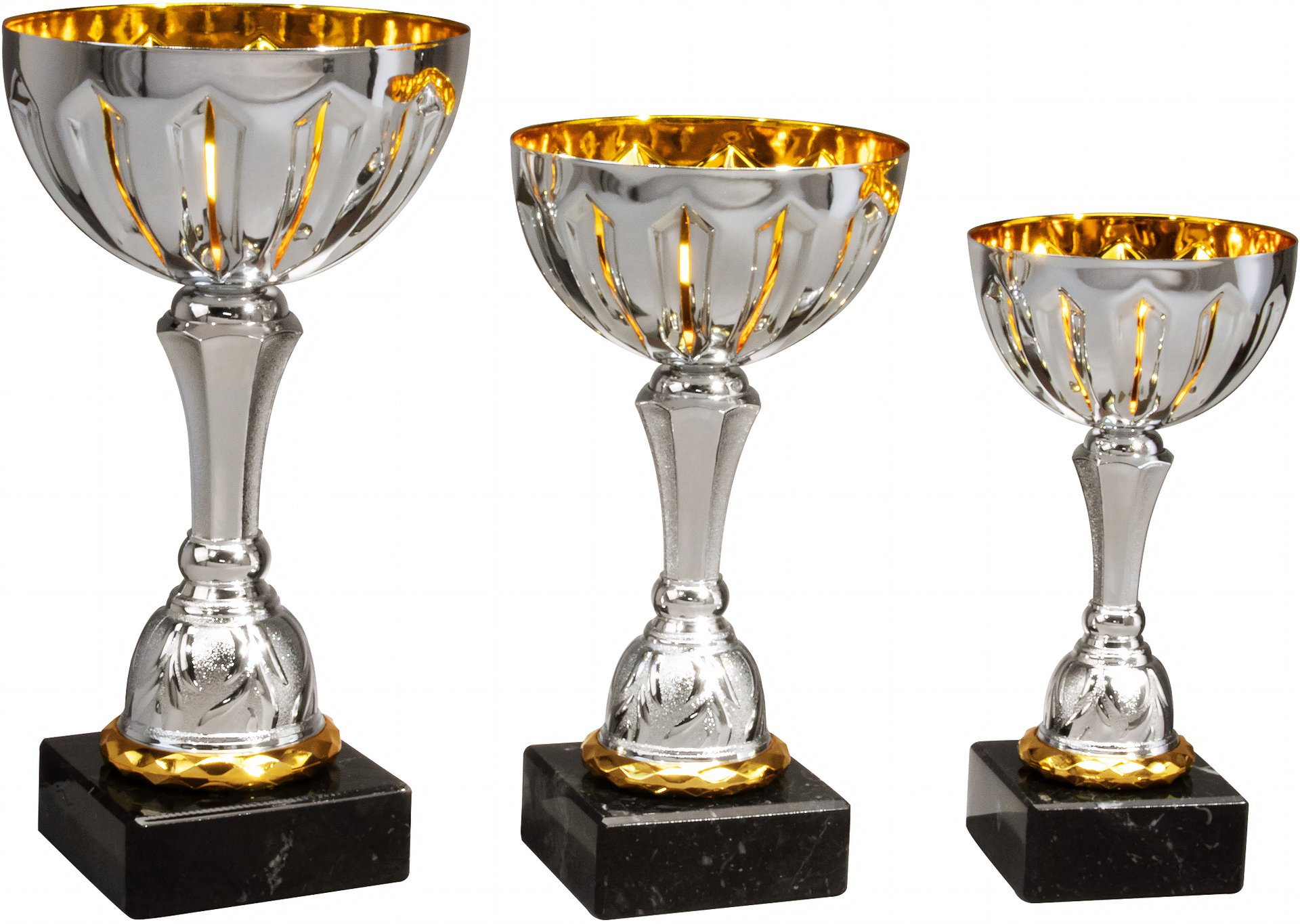 Pokal in Silber, Gold von 19,7 cm – 25,7 cm Höhe in Standard Qualität. Individuelle Sockelbeschriftung auf Gravurplatte. Dieser Pokal ist universell für jede Zielgruppe/Sportart einsetzbar. Als 3er-Serie erhältlich.