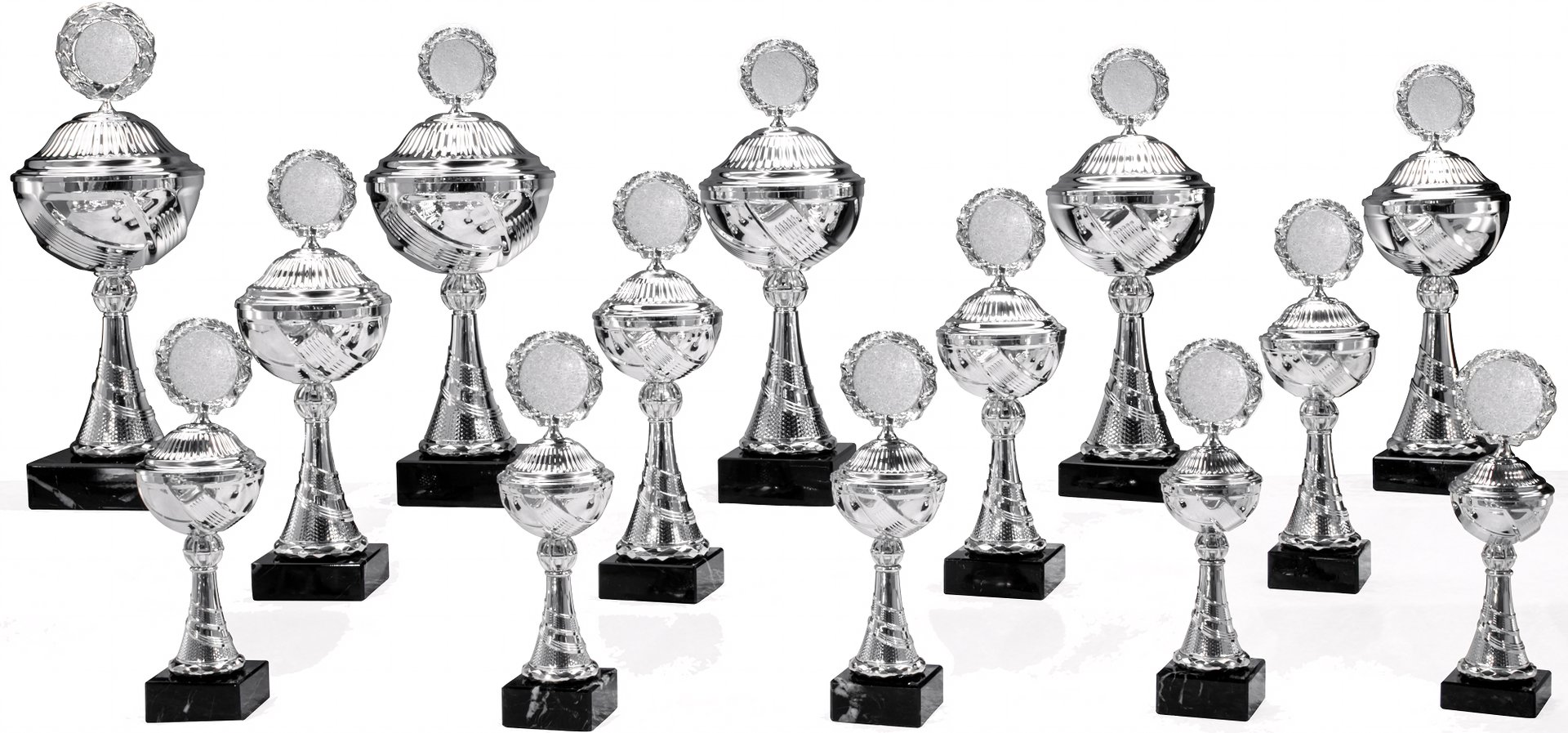 1Pokal in Silber von 25,3 cm – 43 cm Höhe in Standard Qualität. Individuelle Sockelbeschriftung auf Gravurplatte. Emblem in 50 mm Durchmesser wählbar aus über 300 Designs oder einem eigenen Emblem. Dieser Pokal ist universell für jede Zielgruppe/Sportart einsetzbar. Als 4er-Serie erhältlich.