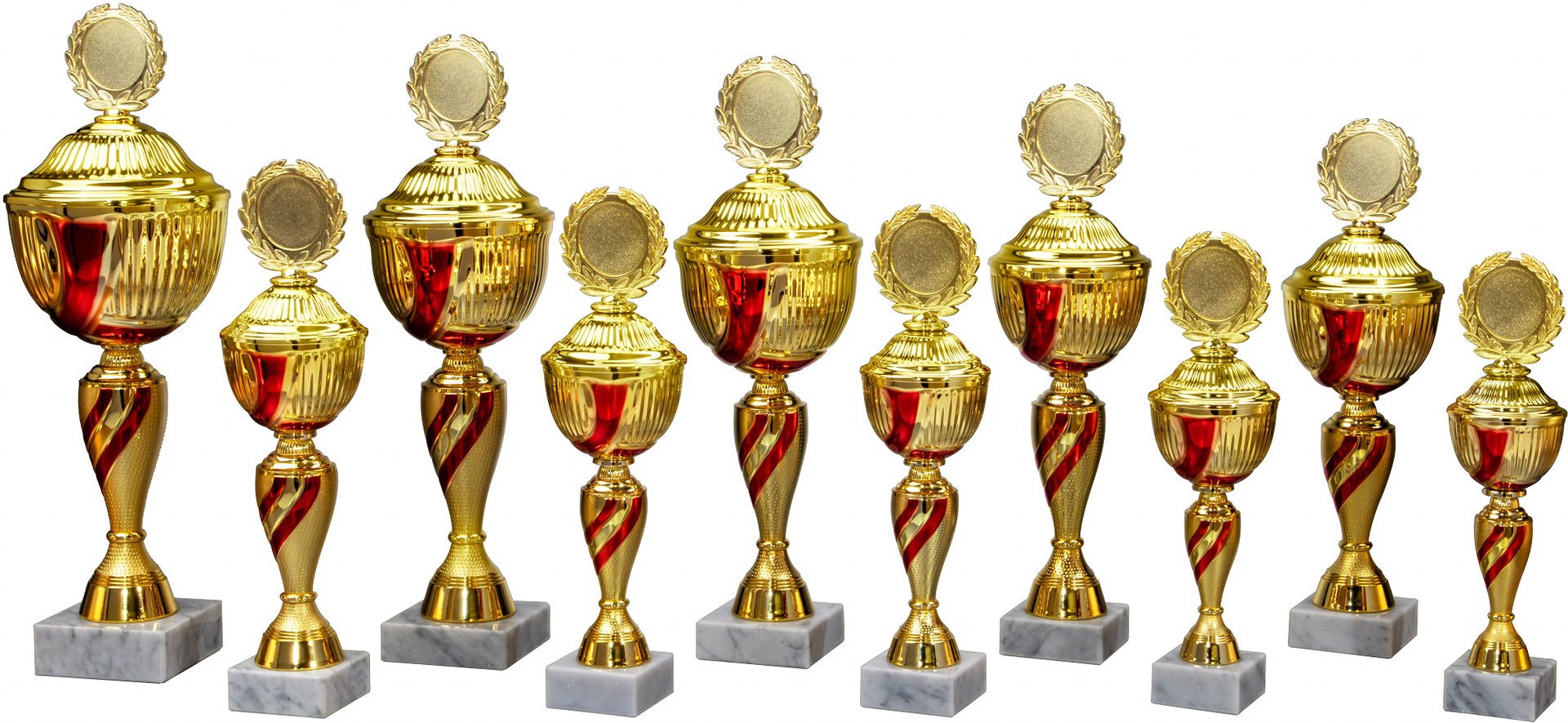 Pokal in Gold, Rot von 32,3 cm – 48,8 cm Höhe in Standard Qualität. Individuelle Sockelbeschriftung auf Gravurplatte. Emblem in 50 mm Durchmesser wählbar aus über 300 Designs oder einem eigenen Emblem. Dieser Pokal ist universell für jede Zielgruppe/Sportart einsetzbar. Als 10er-Serie erhältlich.
