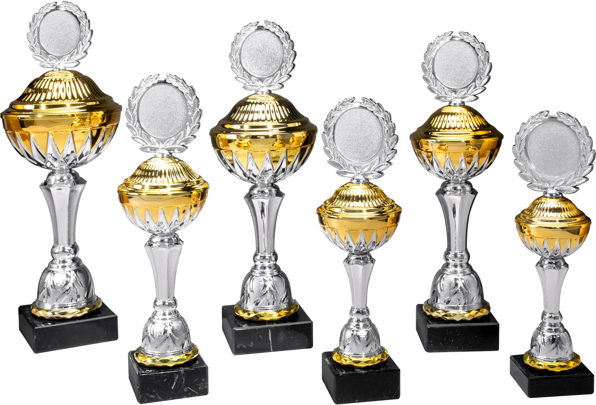 Pokal in Silber, Gold von 26,5 cm – 39,5 cm Höhe in Standard Qualität. Individuelle Sockelbeschriftung auf Gravurplatte. Emblem in 50 mm Durchmesser wählbar aus über 300 Designs oder einem eigenen Emblem. Dieser Pokal ist universell für jede Zielgruppe/Sportart einsetzbar. Als 6er-Serie erhältlich.