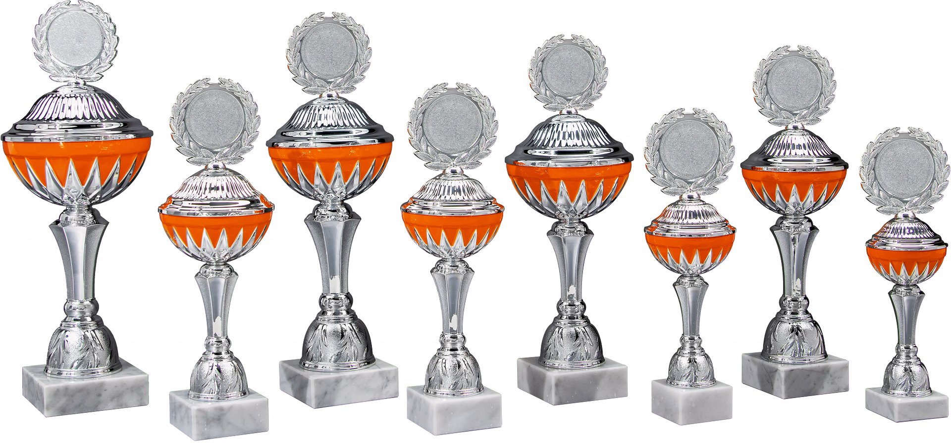 Pokal in Silber, Orange von 25,7 cm – 38,5 cm Höhe in Standard Qualität. Individuelle Sockelbeschriftung auf Gravurplatte. Emblem in 50 mm Durchmesser wählbar aus über 300 Designs oder einem eigenen Emblem. Dieser Pokal ist universell für jede Zielgruppe/Sportart einsetzbar. Als 8er-Serie erhältlich.