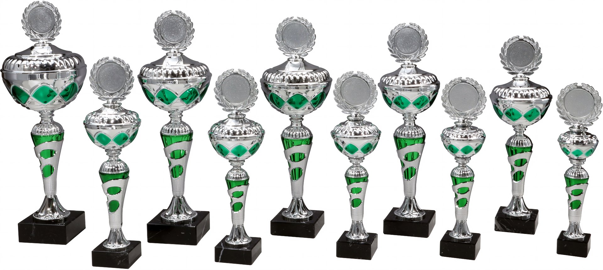 Pokal in Silber, Grün von 31,7 cm – 46,5 cm Höhe in Standard Qualität. Individuelle Sockelbeschriftung auf Gravurplatte. Emblem in 50 mm Durchmesser wählbar aus über 300 Designs oder einem eigenen Emblem. Dieser Pokal ist universell für jede Zielgruppe/Sportart einsetzbar. Als 10er-Serie erhältlich.