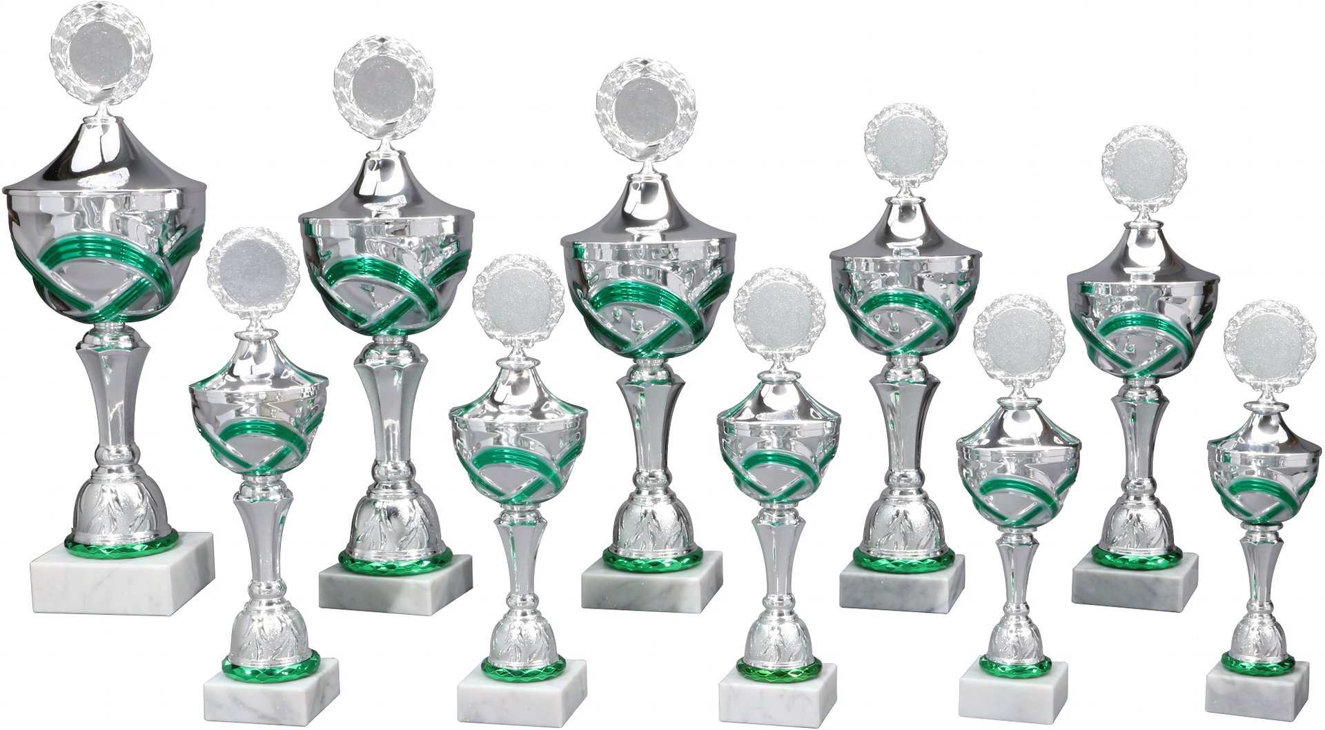 Pokal in Silber, Grün von 30,5 cm – 49,5 cm Höhe in Standard Qualität. Individuelle Sockelbeschriftung auf Gravurplatte. Emblem in 50 mm Durchmesser wählbar aus über 300 Designs oder einem eigenen Emblem. Dieser Pokal ist universell für jede Zielgruppe/Sportart einsetzbar. Als 10er-Serie erhältlich.