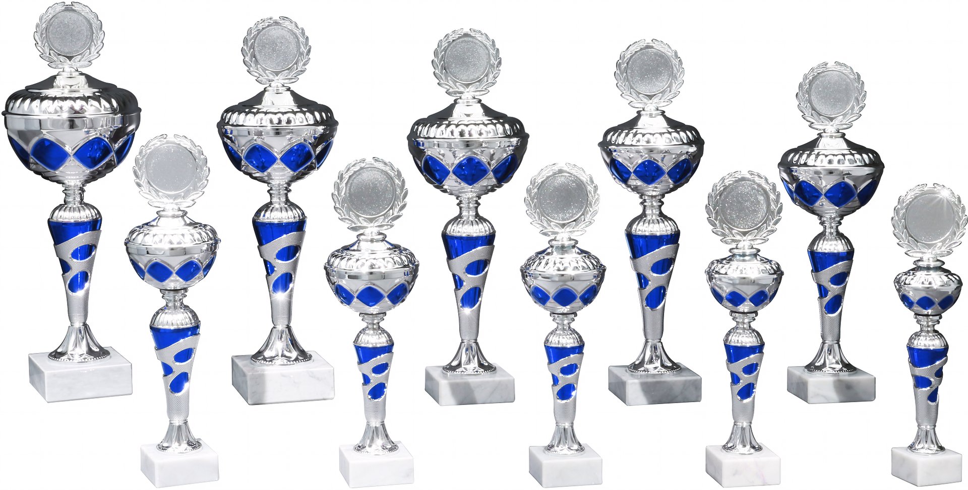 Pokal in Silber, Blau von 31,7 cm – 46,5 cm Höhe in Standard Qualität. Individuelle Sockelbeschriftung auf Gravurplatte. Emblem in 50 mm Durchmesser wählbar aus über 300 Designs oder einem eigenen Emblem. Dieser Pokal ist universell für jede Zielgruppe/Sportart einsetzbar. Als 10er-Serie erhältlich.