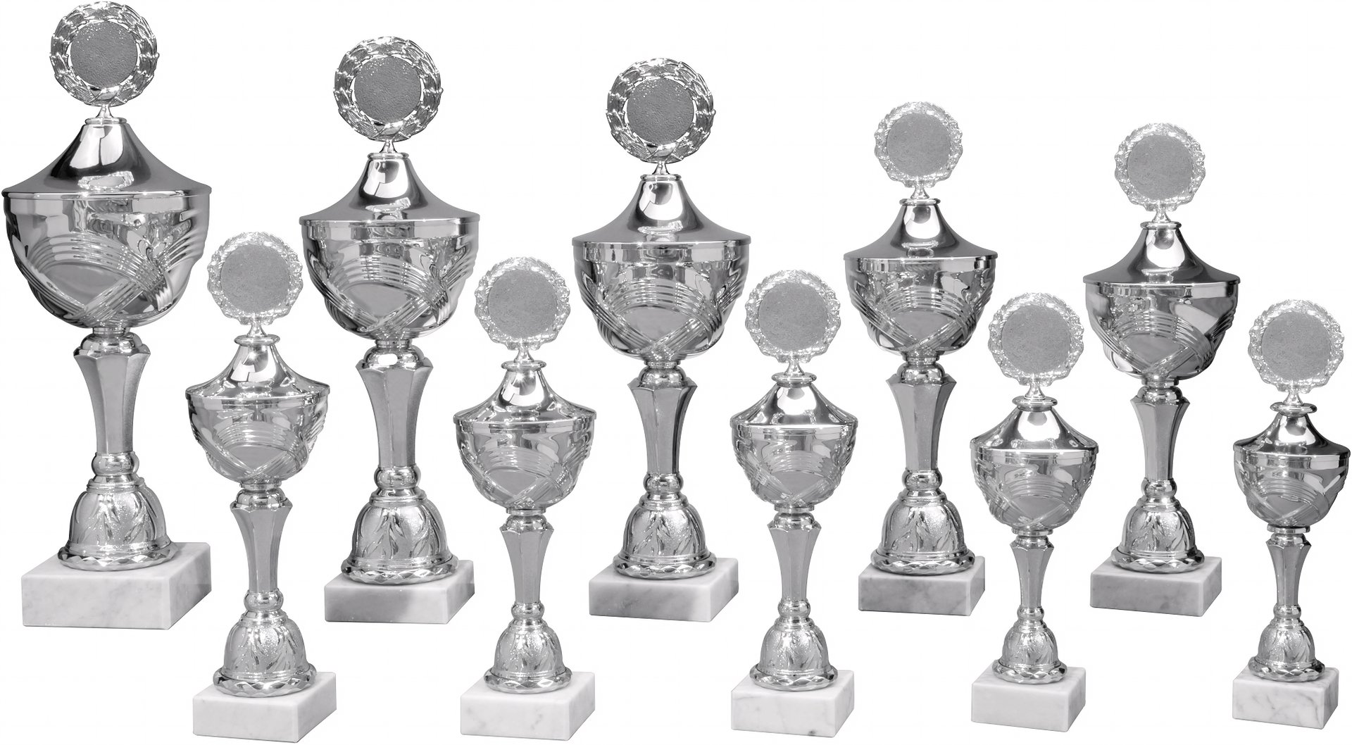 Pokal in Silber von 30,5 cm – 49,5 cm Höhe in Standard Qualität. Individuelle Sockelbeschriftung auf Gravurplatte. Emblem in 50 mm Durchmesser wählbar aus über 300 Designs oder einem eigenen Emblem. Dieser Pokal ist universell für jede Zielgruppe/Sportart einsetzbar. Als 10er-Serie erhältlich.