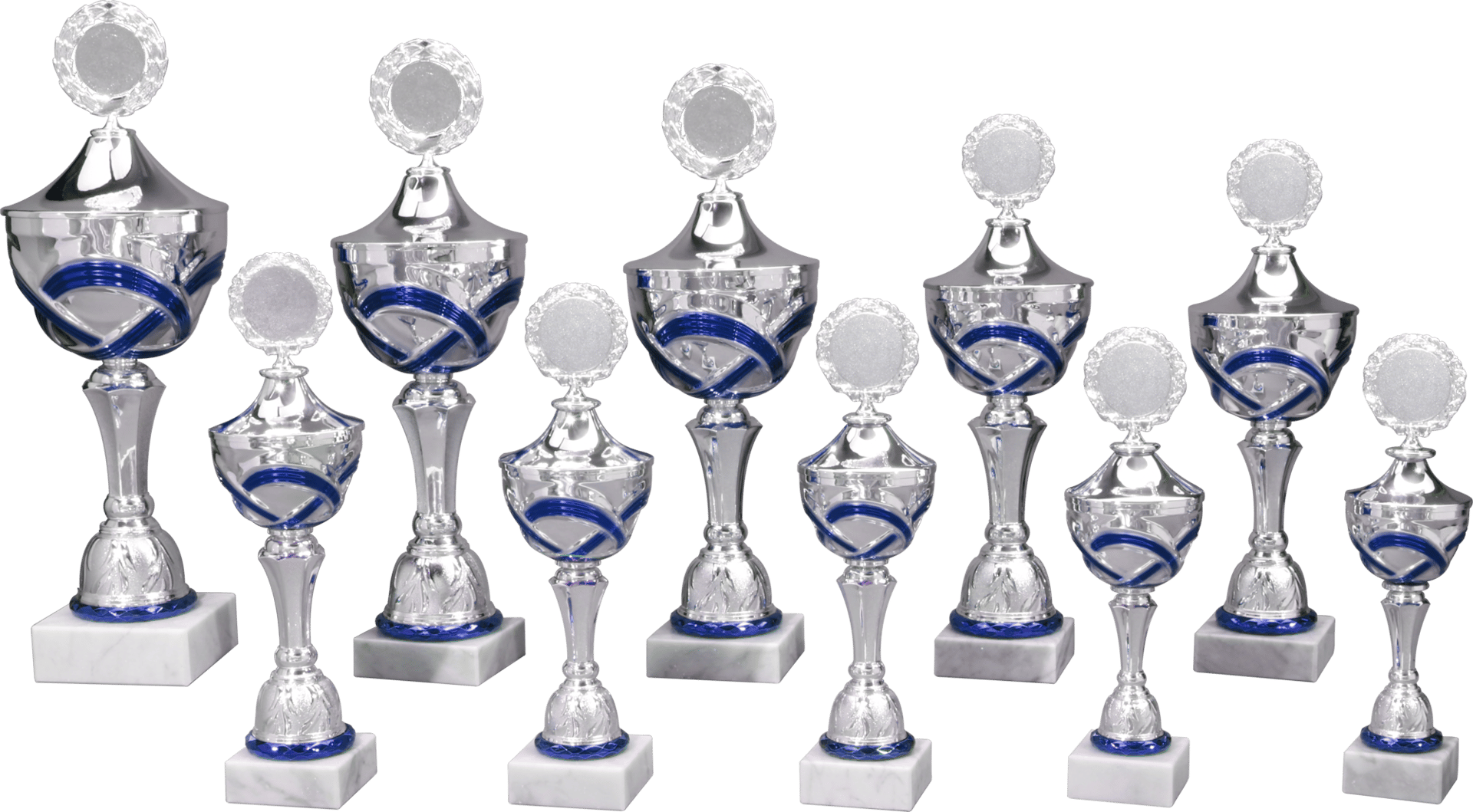 Pokal in Silber, Blau von 30,5 cm – 49,5 cm Höhe in Standard Qualität. Individuelle Sockelbeschriftung auf Gravurplatte. Emblem in 50 mm Durchmesser wählbar aus über 300 Designs oder einem eigenen Emblem. Dieser Pokal ist universell für jede Zielgruppe/Sportart einsetzbar. Als 10er-Serie erhältlich.
