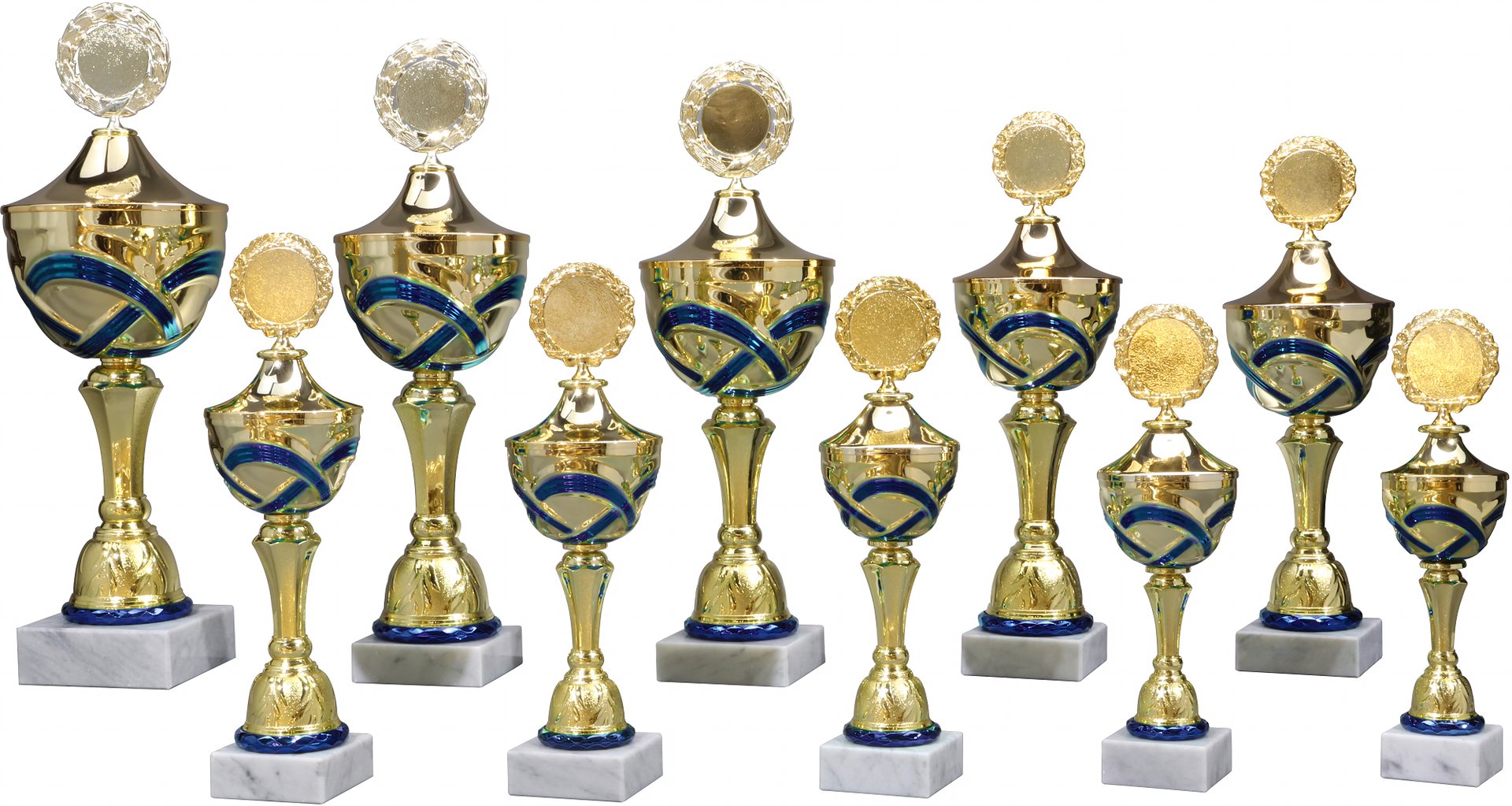 Pokal in Gold, Blau von 30,5 cm – 49,5 cm Höhe in Standard Qualität. Individuelle Sockelbeschriftung auf Gravurplatte. Emblem in 50 mm Durchmesser wählbar aus über 300 Designs oder einem eigenen Emblem. Dieser Pokal ist universell für jede Zielgruppe/Sportart einsetzbar. Als 10er-Serie erhältlich.