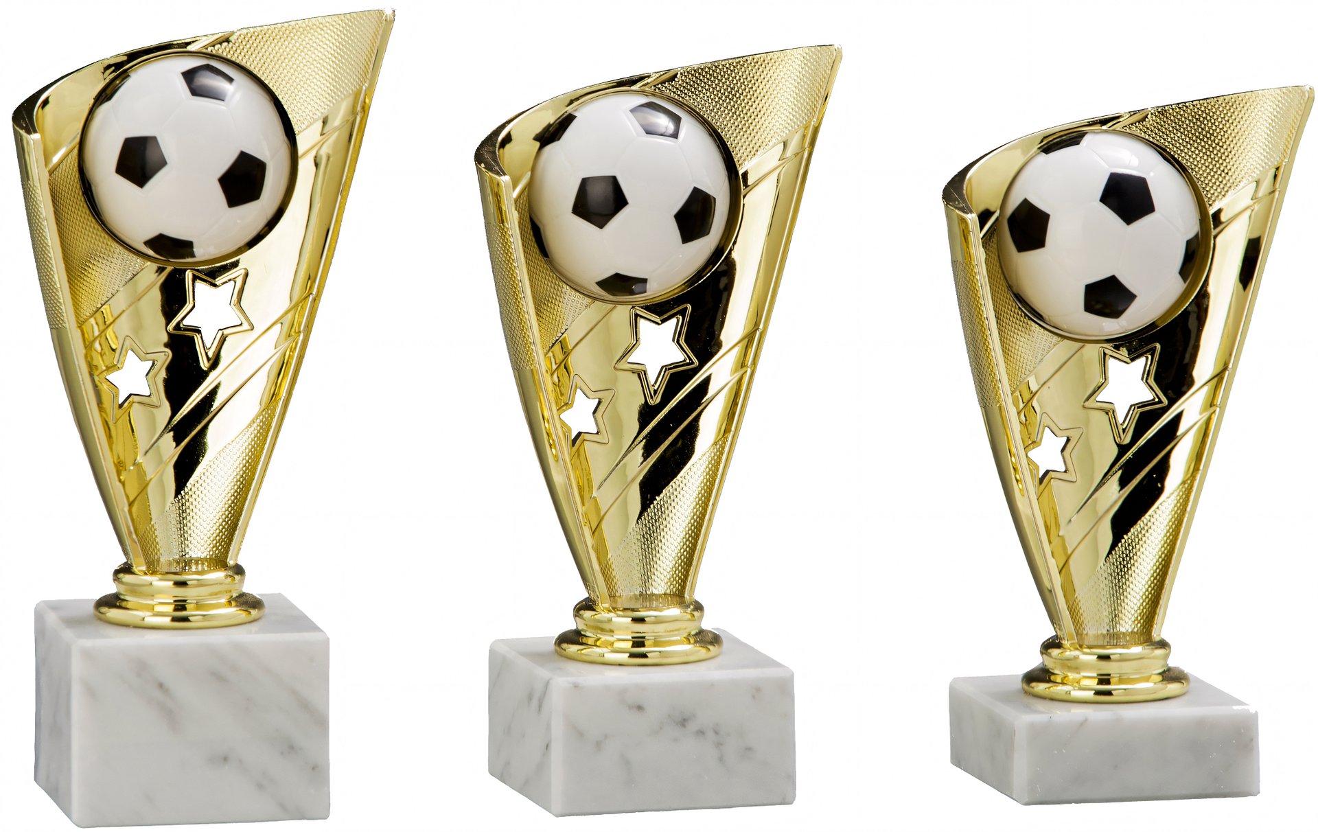 Pokal in Gold von 15 cm – 17 cm Höhe in Standard Qualität. Individuelle Sockelbeschriftung auf Gravurplatte. Dieser Pokal ist speziell für folgende Zielgruppe/Sportart: Fußball. Als 3er-Serie erhältlich.