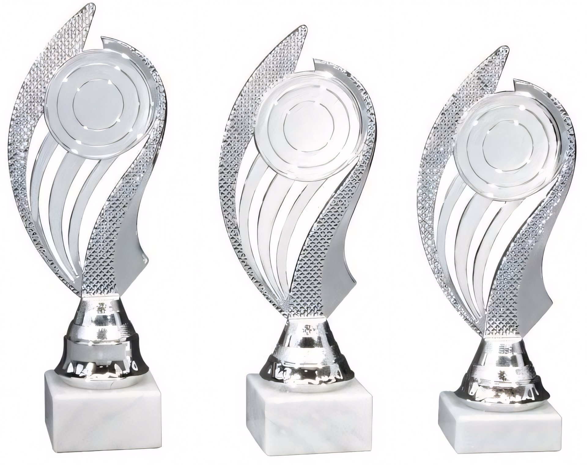 Pokal in Silber von 20 cm – 22 cm Höhe in Standard Qualität. Individuelle Sockelbeschriftung auf Gravurplatte. Emblem in 50 mm Durchmesser wählbar aus über 300 Designs oder einem eigenen Emblem. Dieser Pokal ist universell für jede Zielgruppe/Sportart einsetzbar. Als 3er-Serie erhältlich.