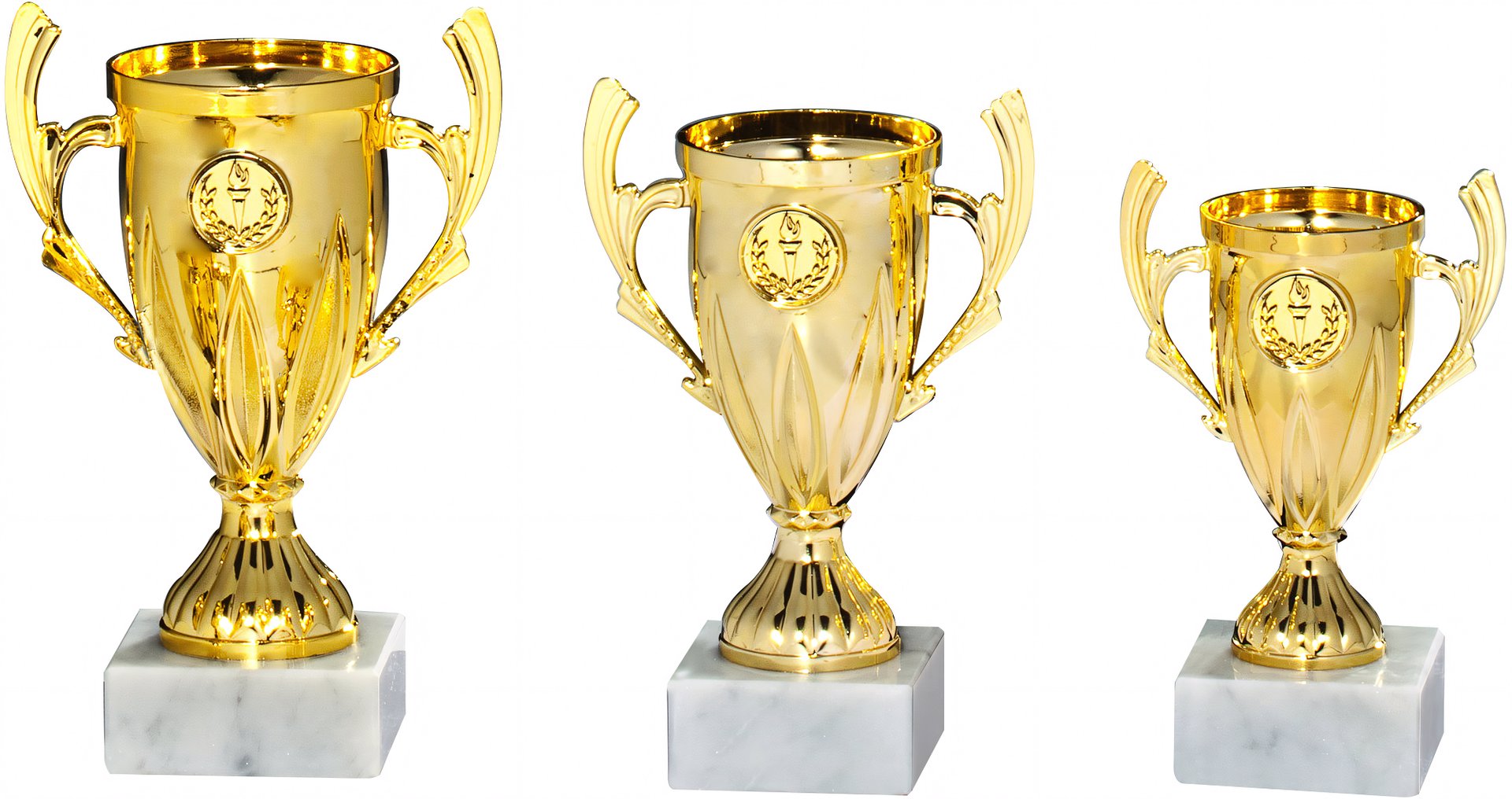 Pokal in Gold von 15 cm – 19 cm Höhe in Standard Qualität. Individuelle Sockelbeschriftung auf Gravurplatte. Dieser Pokal ist universell für jede Zielgruppe/Sportart einsetzbar. Als 3er-Serie erhältlich.