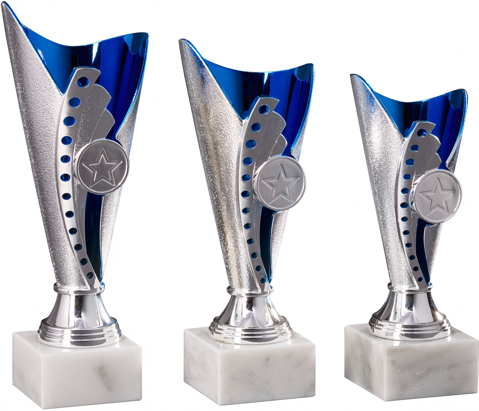Pokal in Silber, Blau von 17 cm – 21 cm Höhe in Standard Qualität. Individuelle Sockelbeschriftung auf Gravurplatte. Dieser Pokal ist universell für jede Zielgruppe/Sportart einsetzbar. Als 3er-Serie erhältlich.