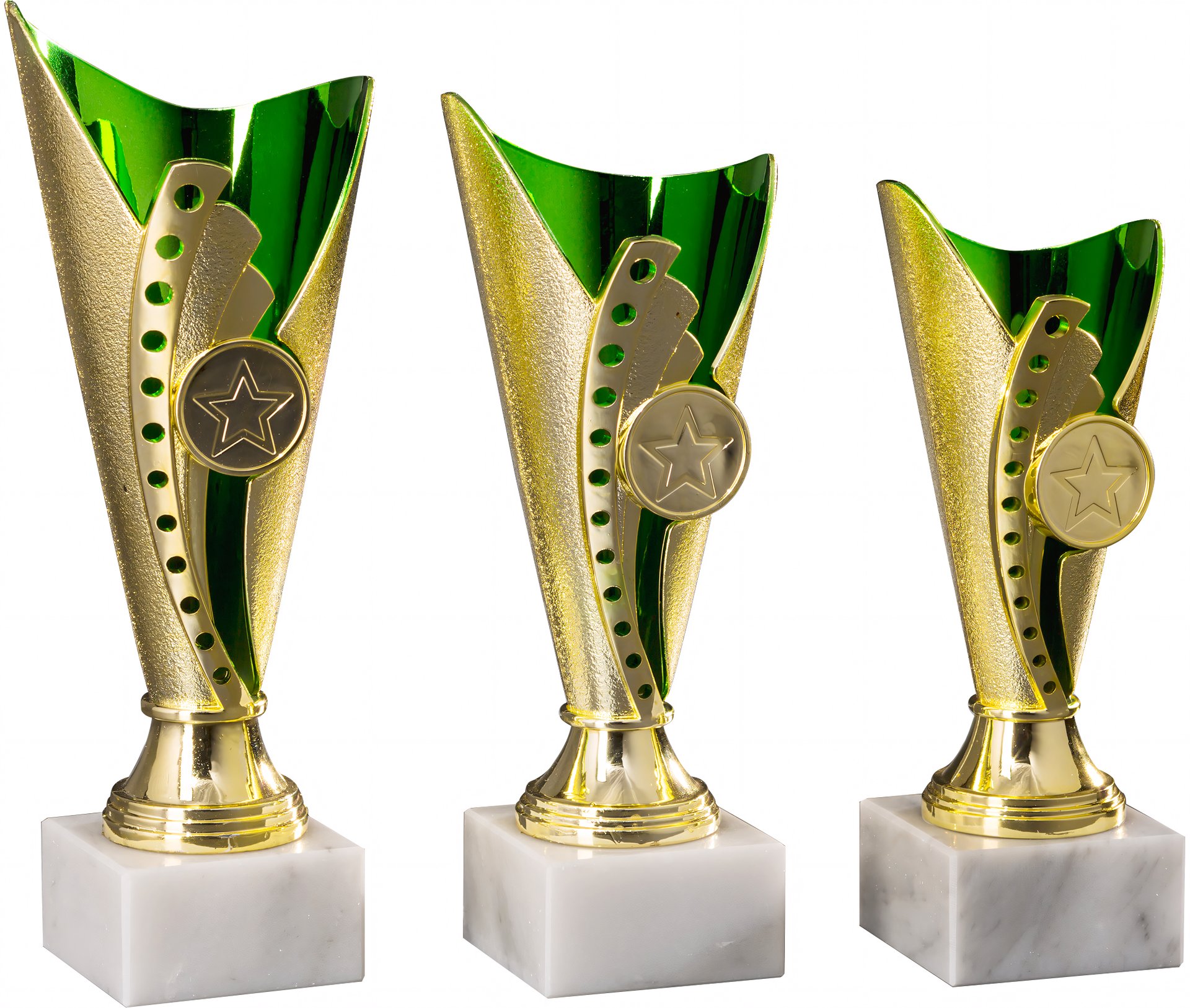 Pokal in Gold, Grün von 17 cm – 21 cm Höhe in Standard Qualität. Individuelle Sockelbeschriftung auf Gravurplatte. Dieser Pokal ist universell für jede Zielgruppe/Sportart einsetzbar. Als 3er-Serie erhältlich.