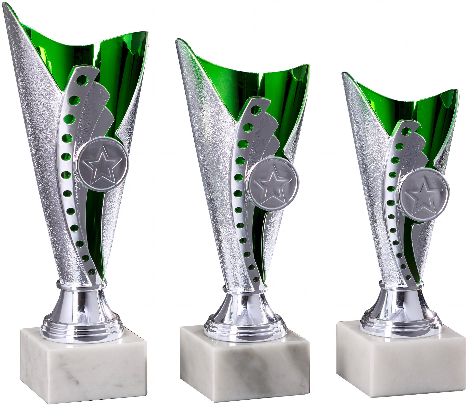 Pokal in Silber, Grün von 17 cm – 21 cm Höhe in Standard Qualität. Individuelle Sockelbeschriftung auf Gravurplatte. Dieser Pokal ist universell für jede Zielgruppe/Sportart einsetzbar. Als 3er-Serie erhältlich.